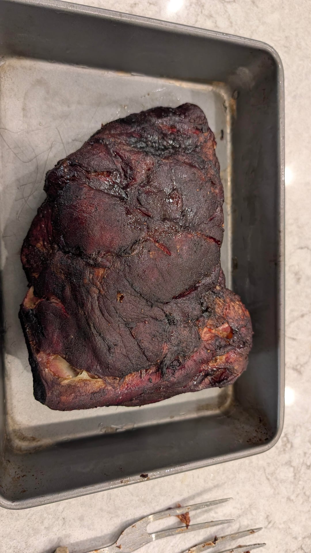 Local pork shoulder. 8lbs for $10. Smoked low and slow (Camp Chef 24DLX) for 16 hours. Pulled like butter.by gktravis 1 Comment Pho-Soup 1 week ago NC pulled pork and you got Sweet Baby Rays sitting there?!? Where’s the vinegar sauce?? Just messin with ya a bit – looks great! Temp? Wrap/no wrap?