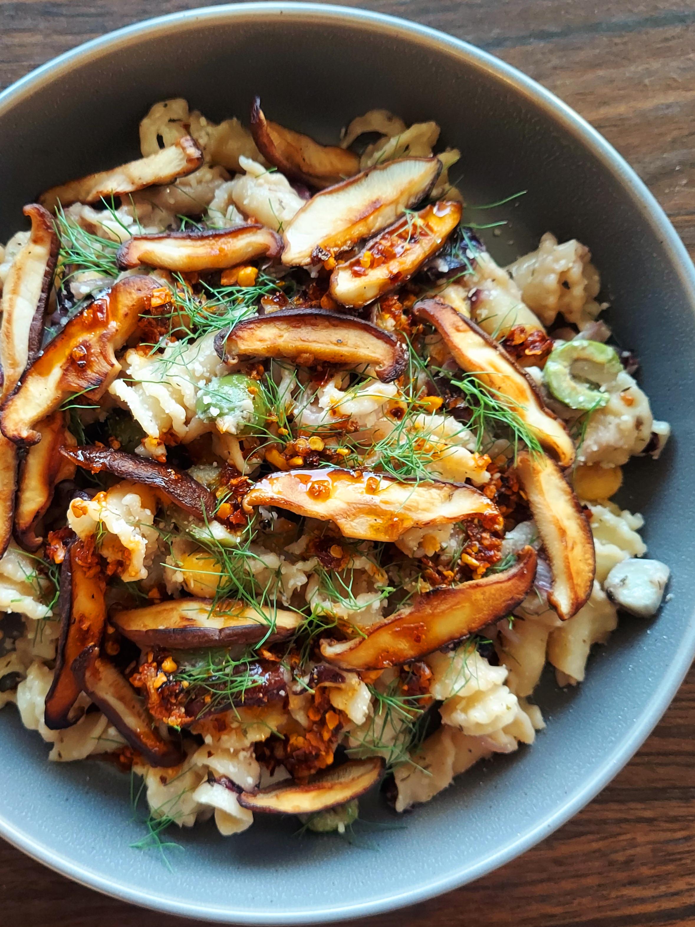Gigli pasta in a white wine "cream" sauce with radicchio, lupini beans, Castelvetrano olives, and seared shiitake mushrooms, finished with Tin Man Oils Carolina chili crisp.
