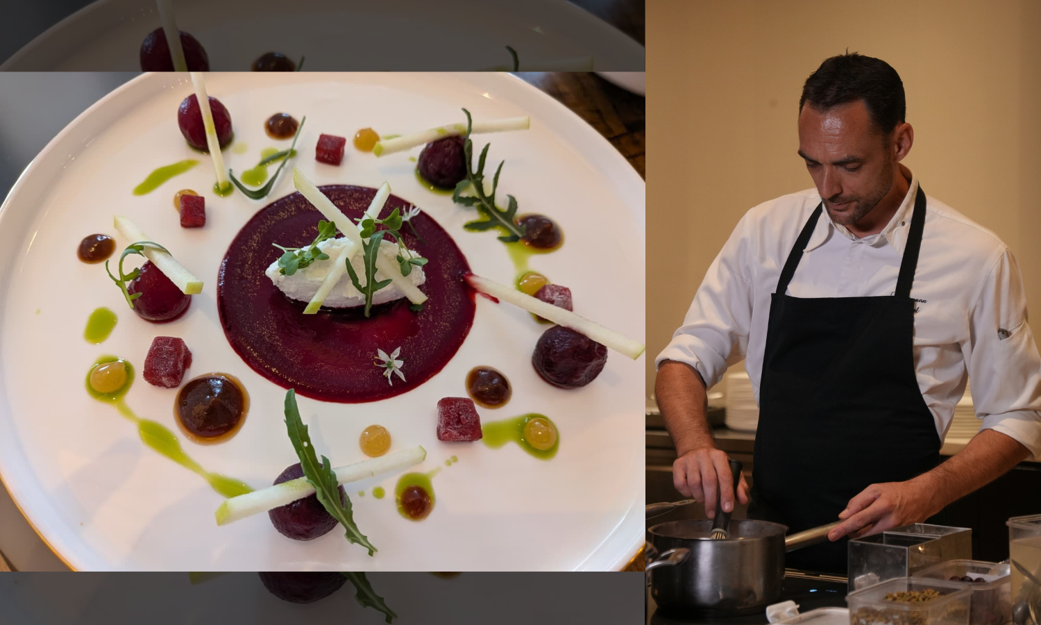 One of the more interesting plates is what looks like a scallop but isn’t one. A radish is shaped and treated with the same technique, paired with spinach purée, roasted seeds and a light lemon butter sauce. “I wanted to play with perception,” he says. “You see one thing, but you taste something else.”