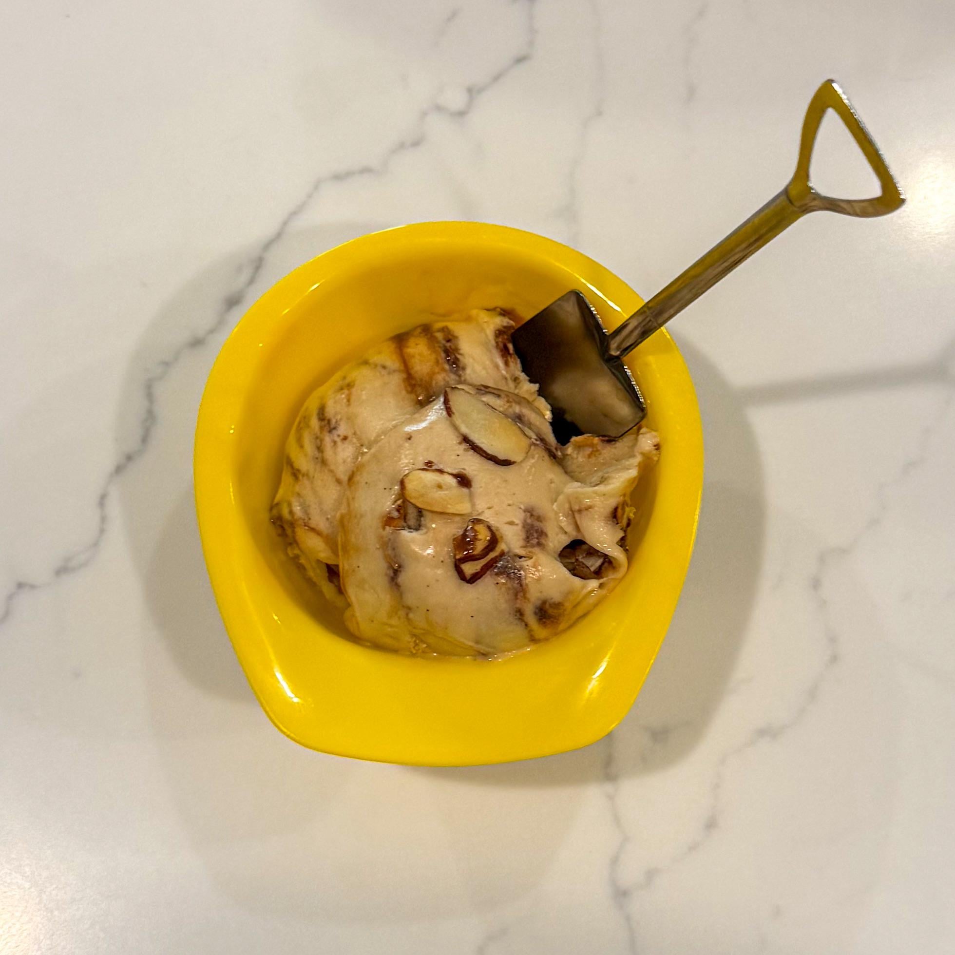 In a freezer-safe container: Lay down a base layer of ice cream, drizzle fudge ripple (I used about half the batch and froze the rest) and sprinkle buttered almonds. Repeat layers until the container is filled.