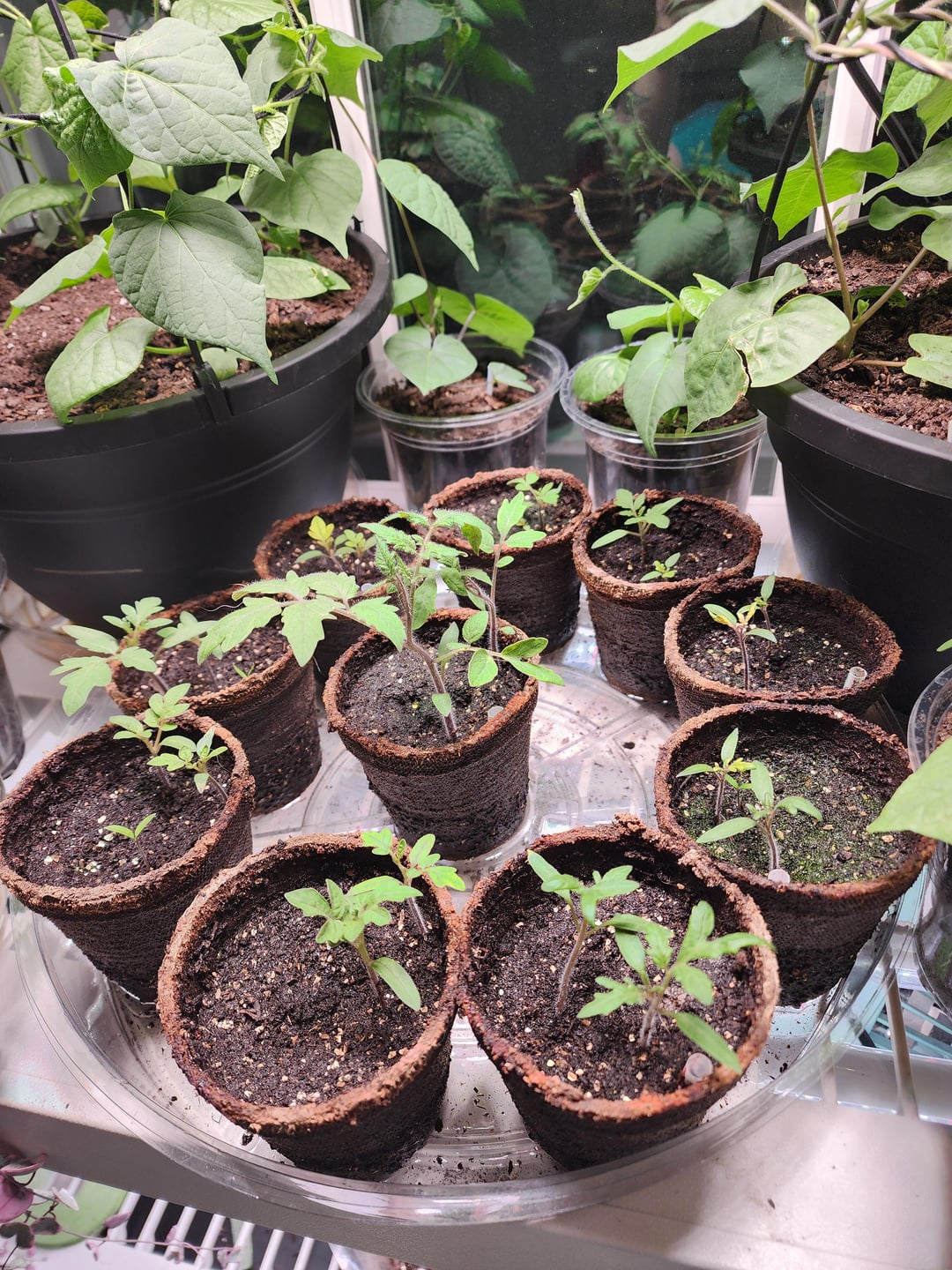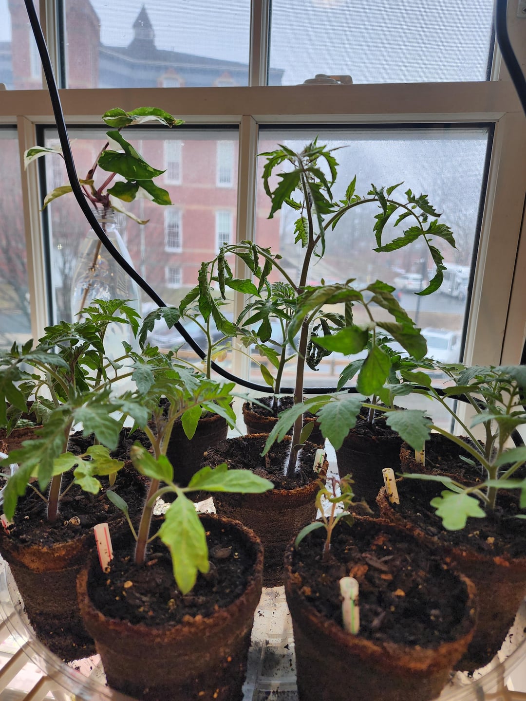 These guys are ten weeks old and beginning to fruit! They are in an east facing window and under 240 watt grow lights. They are staked, fertilized when I remember to, have a fan for 12 hours, and hand pollinated every morning with an electric toothbrush 😊 for anyone who thinks no land/porch = no home grown tomatoes! 🍅