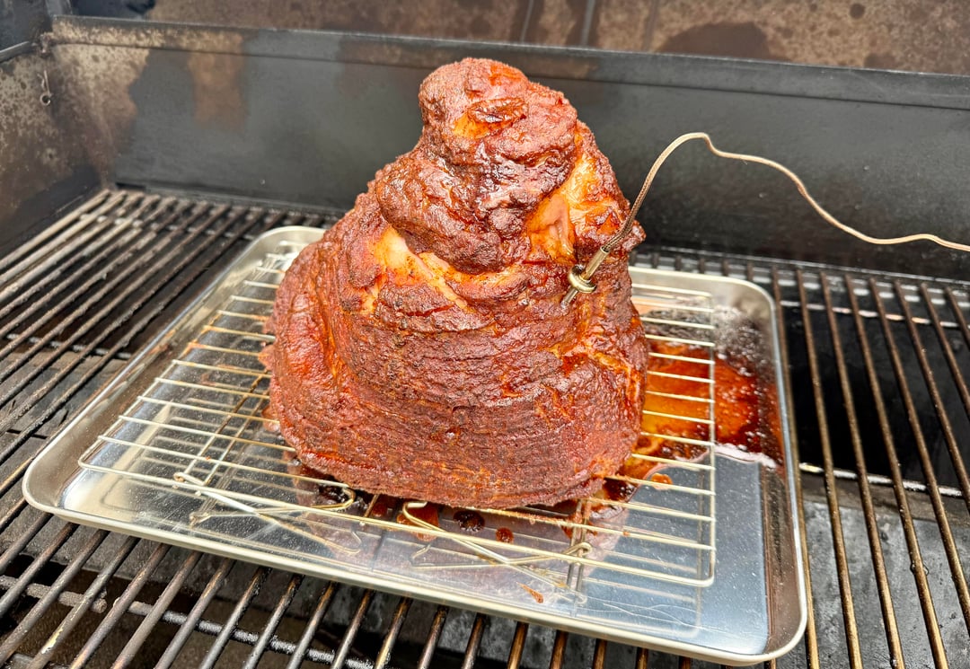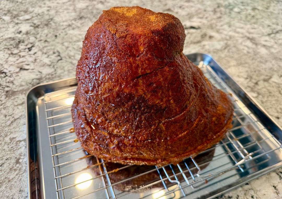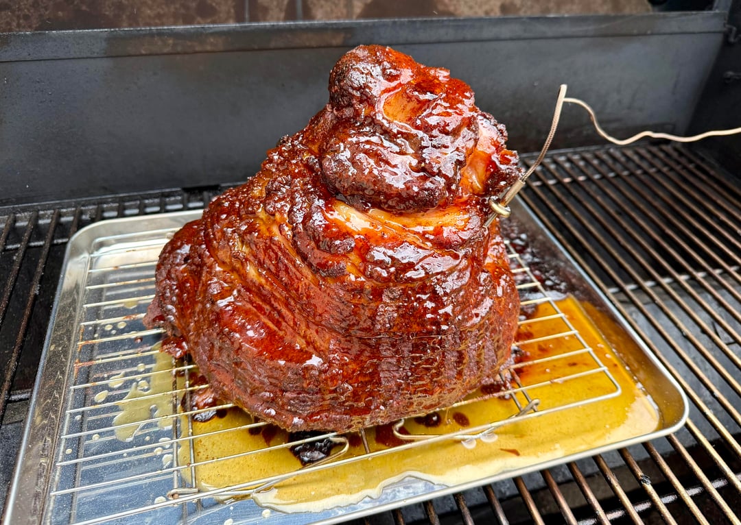 Double smoked spiral ham on the Searwood XL today. Used dijon mustard as a binder. Then covered in MC Honey Hog Bacon and Kosmo Honey Killer Bee. On the grill at 275 for what seemed like forever til I had an internal temp of 140 degrees. Glazed with a maple syrup/butter/honey/brown sugar diabeetus concoction I whipped up. Was delicious and can’t wait to make some ham bone soup from the bone.