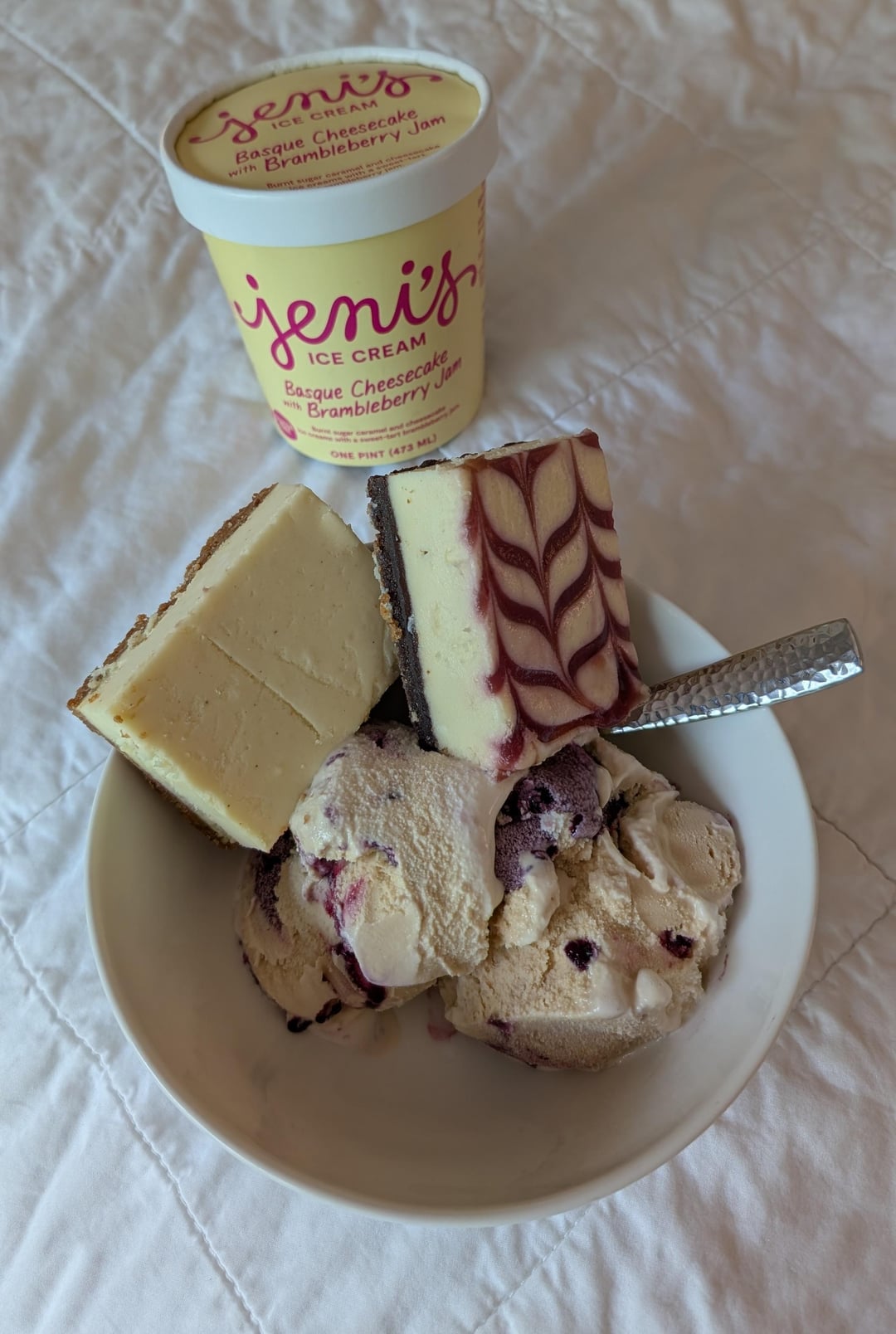 I finally got my hands on Jeni's seasonal flavor 'Basque Cheesecake with Brambleberry Jam'. As is usual with Jeni's the quality and flavor is phenomenal but the texture was a huge fat miss for me – an icecream with the name cheesecake in it is simply begging for cheesecake bits mixed through it to give it texture and body. So I took matters into my own hands 😈