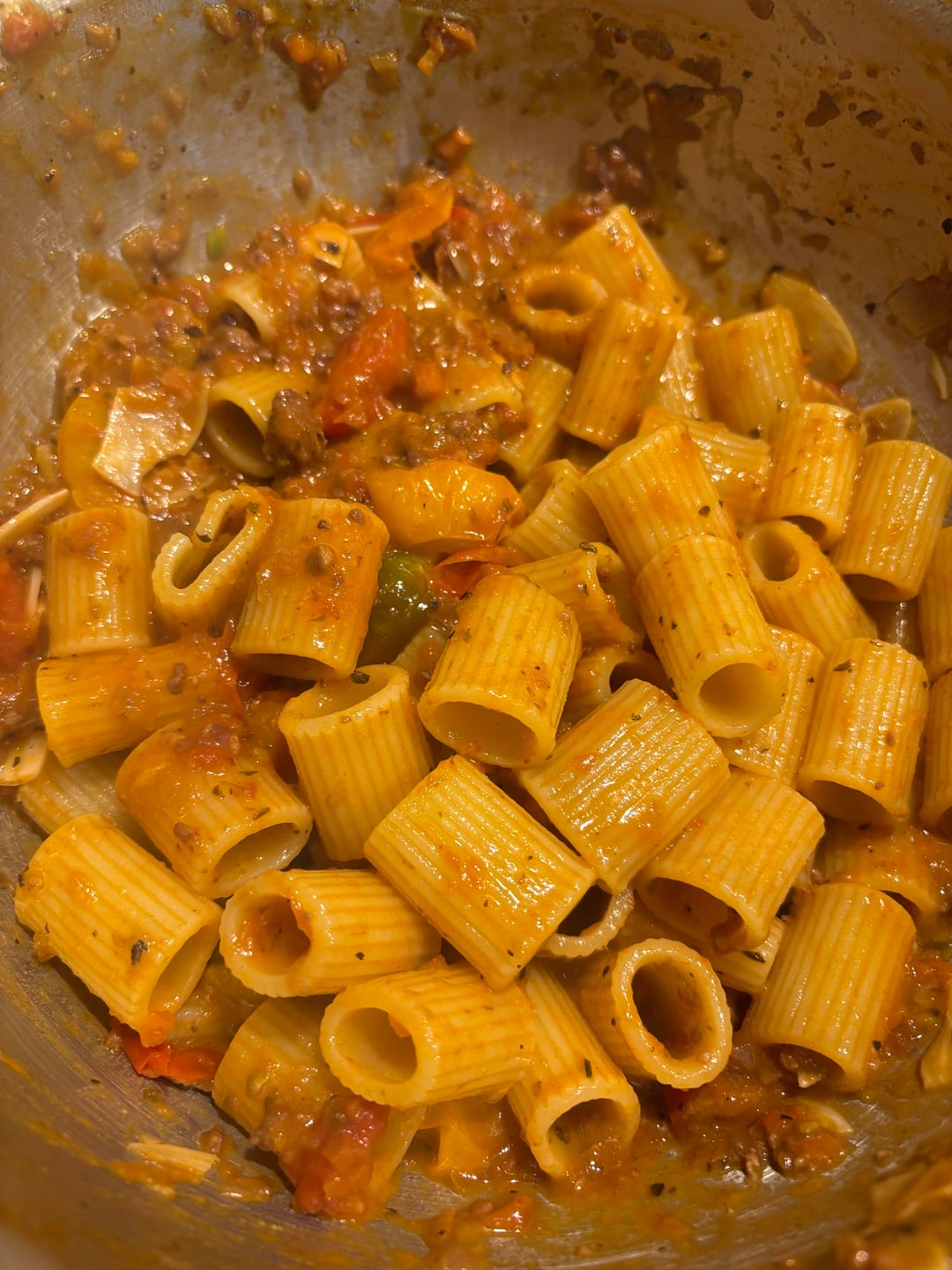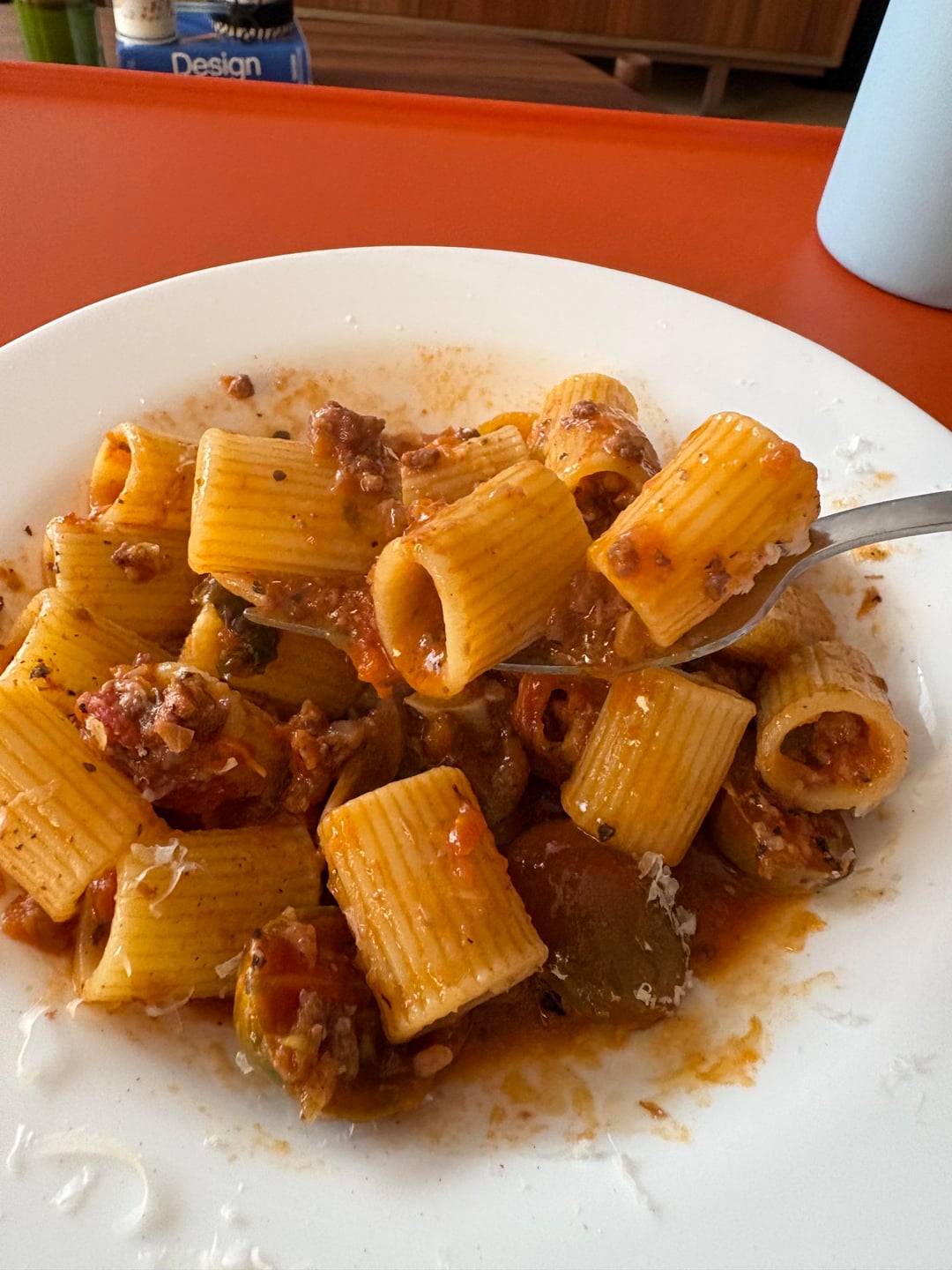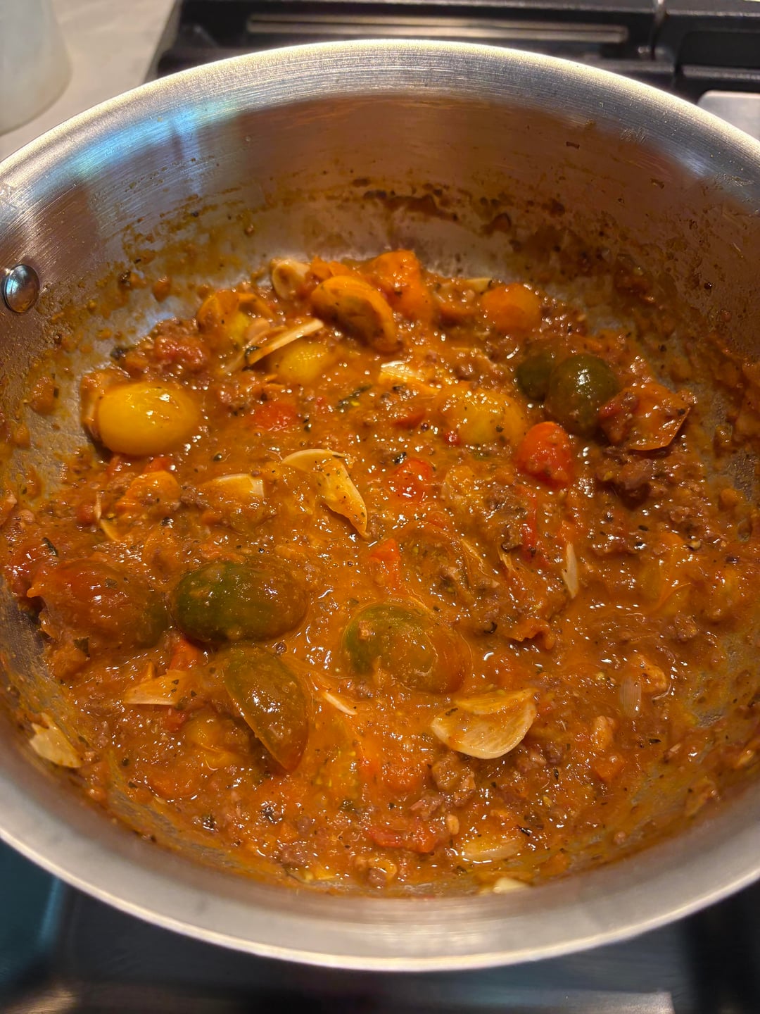 Homemade ragu sautéed with with cherry tomatoes and sliced garlic