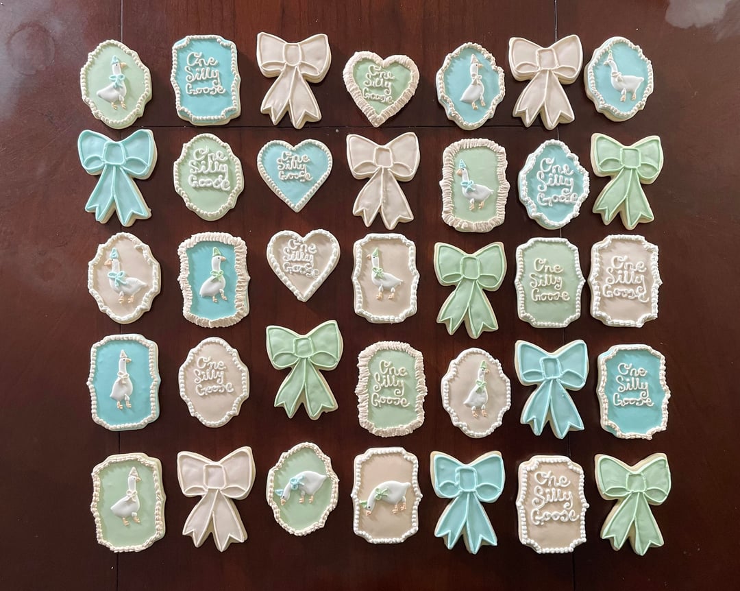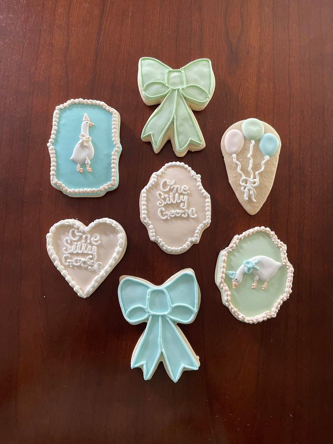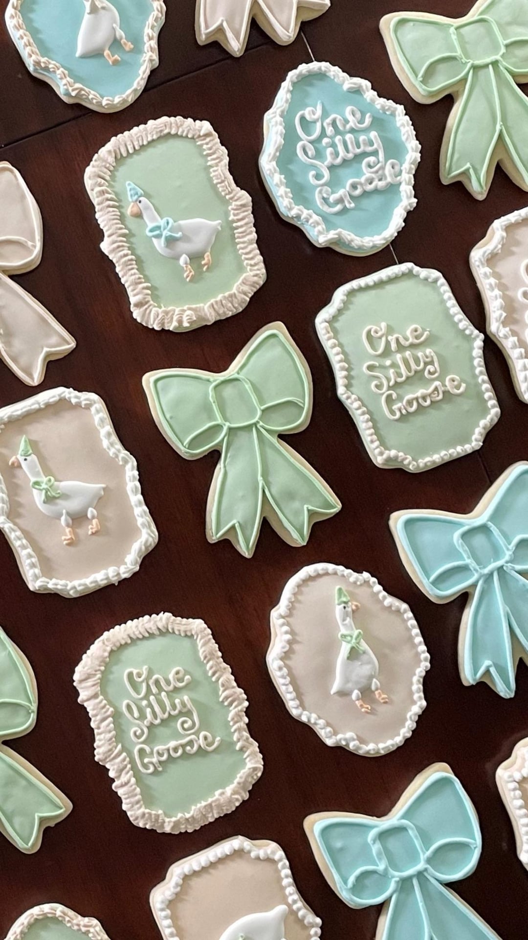 I made the geese separately as sprinkles and applied them to the dry cookies with a tiny bit of watered down frosting. The geese feet did not come off the acetate so I did have to pipe those back on afterwards. It made for a very fun leftover cookie.
