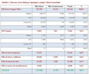 It is the photography that the Fraud Repression Institute took place on March 31st, with the timely report where it emerges that There are over 300 thousand tons of oil in stock overall.foreign extra virgin olive oil reaches 90 thousand tons, a significant increase compared to the same period last year when they were just over 70 thousand. In particular Community oil has exceeded 67 thousand tons (10 thousand more than last year) and the extra EU one or mixed between EU and extra EU equal to 22 tons (8 thousand more than on March 31, 2025). They also stand at 50 thousand tons of minor types of oils between lampante, refined, and pomace olive oil. Virgin olive oil is practically nonexistent (just 3.500 tons).