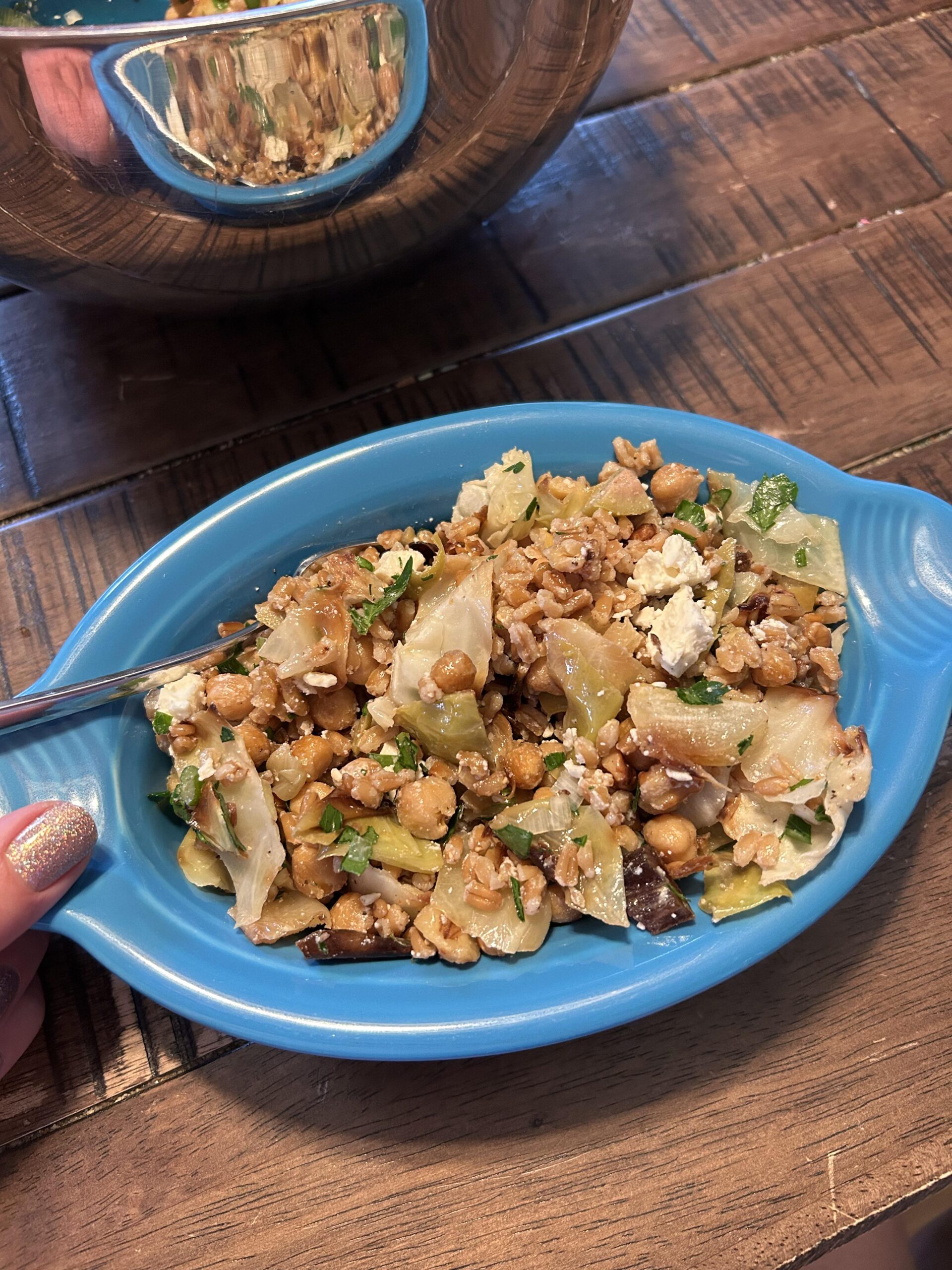 Farro, roasted fennel and cabbage, crispy chickpeas, walnuts, feta, parsley, dates, green olives, lemon, garlic salt.