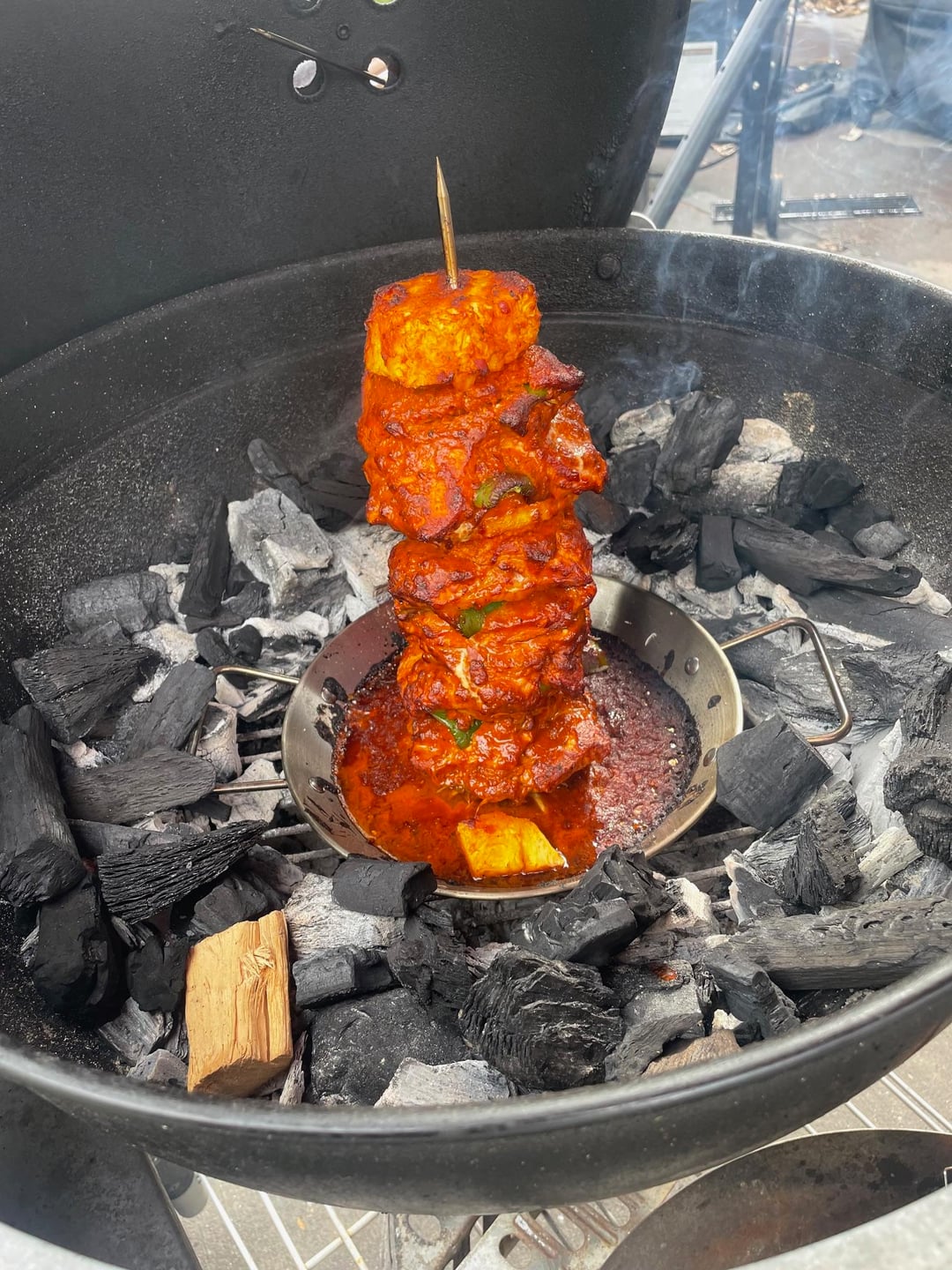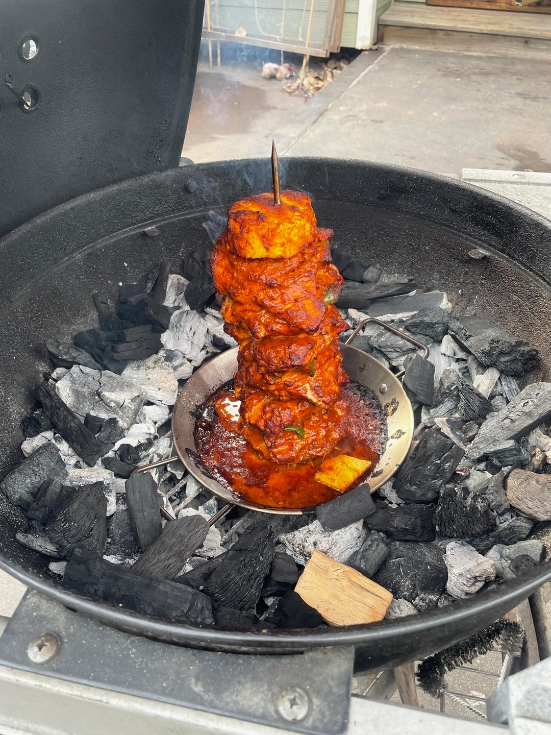 Thin sliced pork with fresh pineapple rounds between. I removed the upper grate so the spike would fit under the lid. Two chunks Hickory. 375° as I could in rain and wind. 3 hours total.