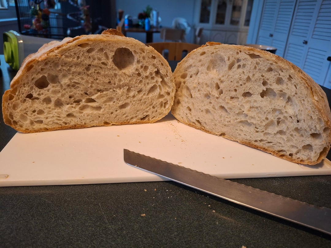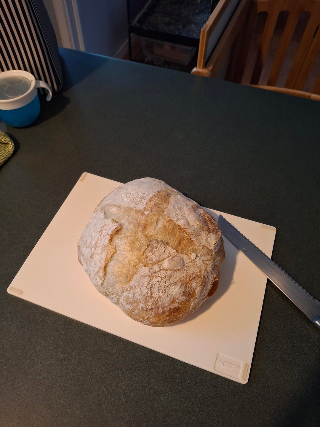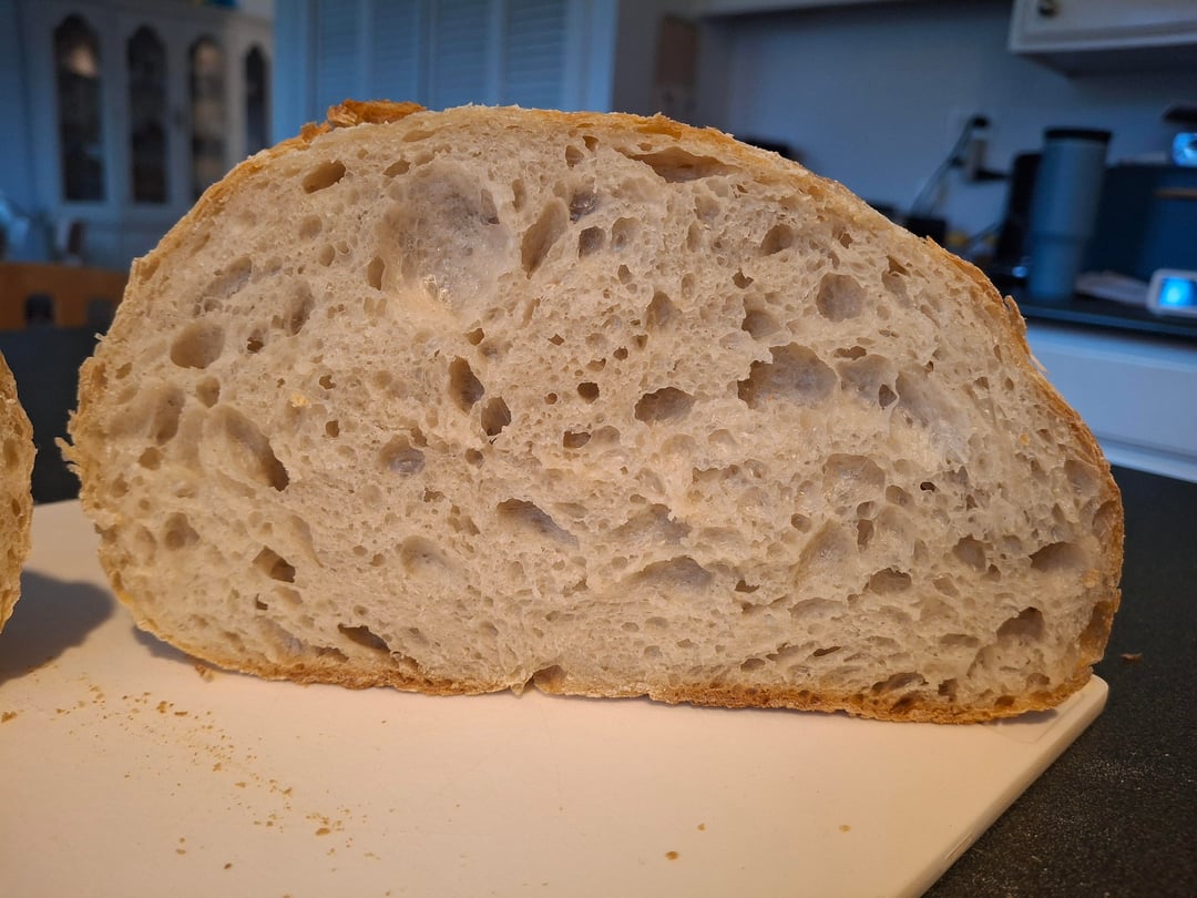 She's not pretty, but she stayed intact through me scraping the towel off so I'm happy. Only my second successful loaf, maybe a little gummy? Still very tasty though! Tell me what the crumb is telling you more experienced bread bakers please!
