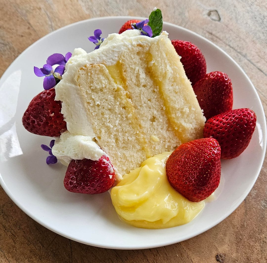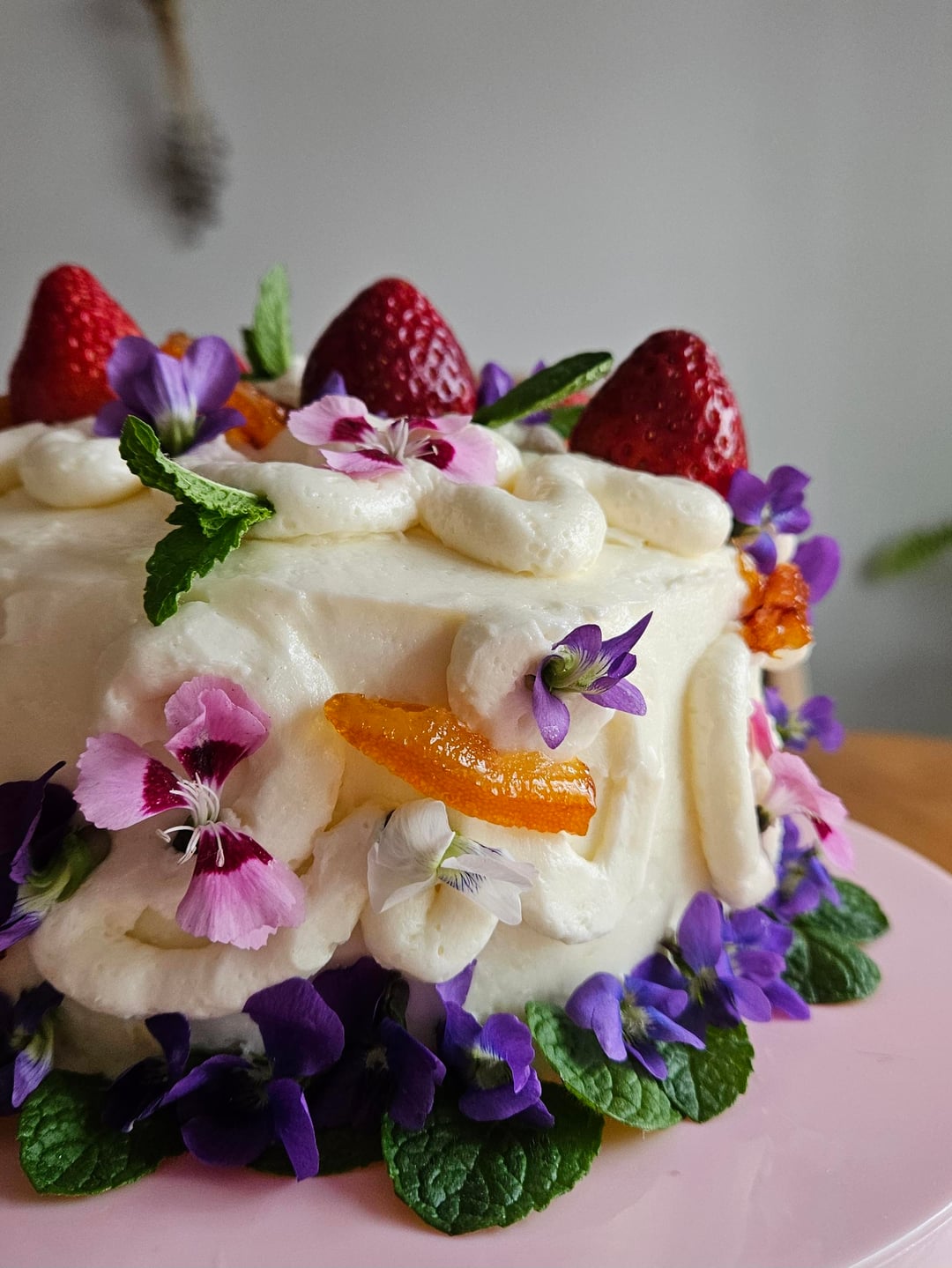 JustMediocreAtBest 1 day ago Cake – [Lemon Cloud Cake](https://www.kingarthurbaking.com/recipes/lemon-cloud-cake-recipe) from King Arthur. Halved the recipe for 3 short 6″ layers.Filling – [Lemon Curd](https://sallysbakingaddiction.com/how-to-make-lemon-curd/#tasty-recipes-69970) from Sally’s Baking. Thicker recipe found in the notes. Instant vanilla pudding mix made with slightly less milk for thickness. Eyeballed 1:1 mix.Frosting – [Ermine Frosting](https://www.kingarthurbaking.com/recipes/ermine-frosting-cooked-flour-frosting-recipe) from King Arthur. ~~I love the taste and texture of ermine but it prob wasn’t the best choice here I was fighting to smooth it and the lines but also I’m not good at frosting in general.~~Decor – candied orange peels, strawberries, mint, dianthus, and wild violets.