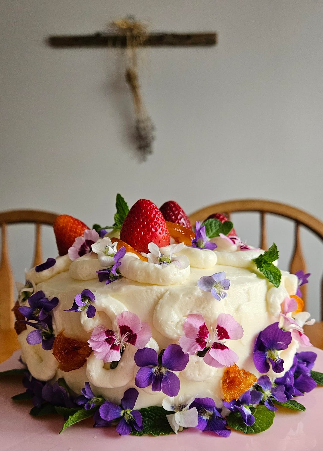 Evening_Lie_2050 1 day ago this cake is a total spring vibe! love the fresh flowers and strawberries on top, it looks delicious and so pretty.