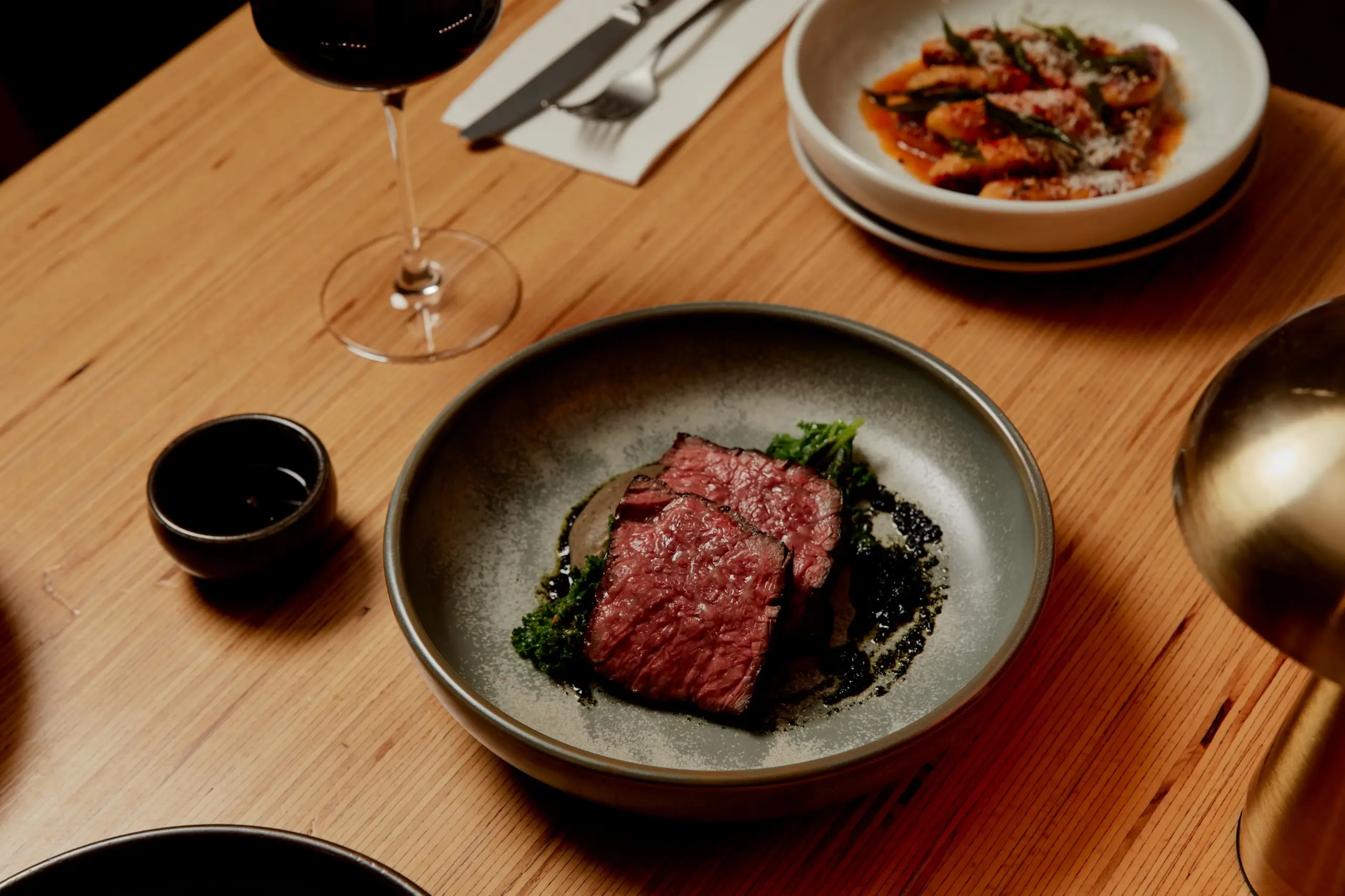 The Wagyu tartare is paired with nashi pear and whipped tahini, while gnocchi is coated in gochujang butter with curry leaf and sesame. On the woodfired side, Wagyu flap is served with eggplant, nori oil and kale, while the fish of the day comes with a doenjang beurre blanc and pickled zucchini – a subtle shift that adds depth without overpowering the star ingredient. Even smaller plates follow the same logic: Pacific oysters arrive with kimchi granita and nashi pear mignonette, and a galbi beef rib sando folds the Korean-style galbi marinade into something more recognisably Melbourne, riffing on the classic steak sanga.