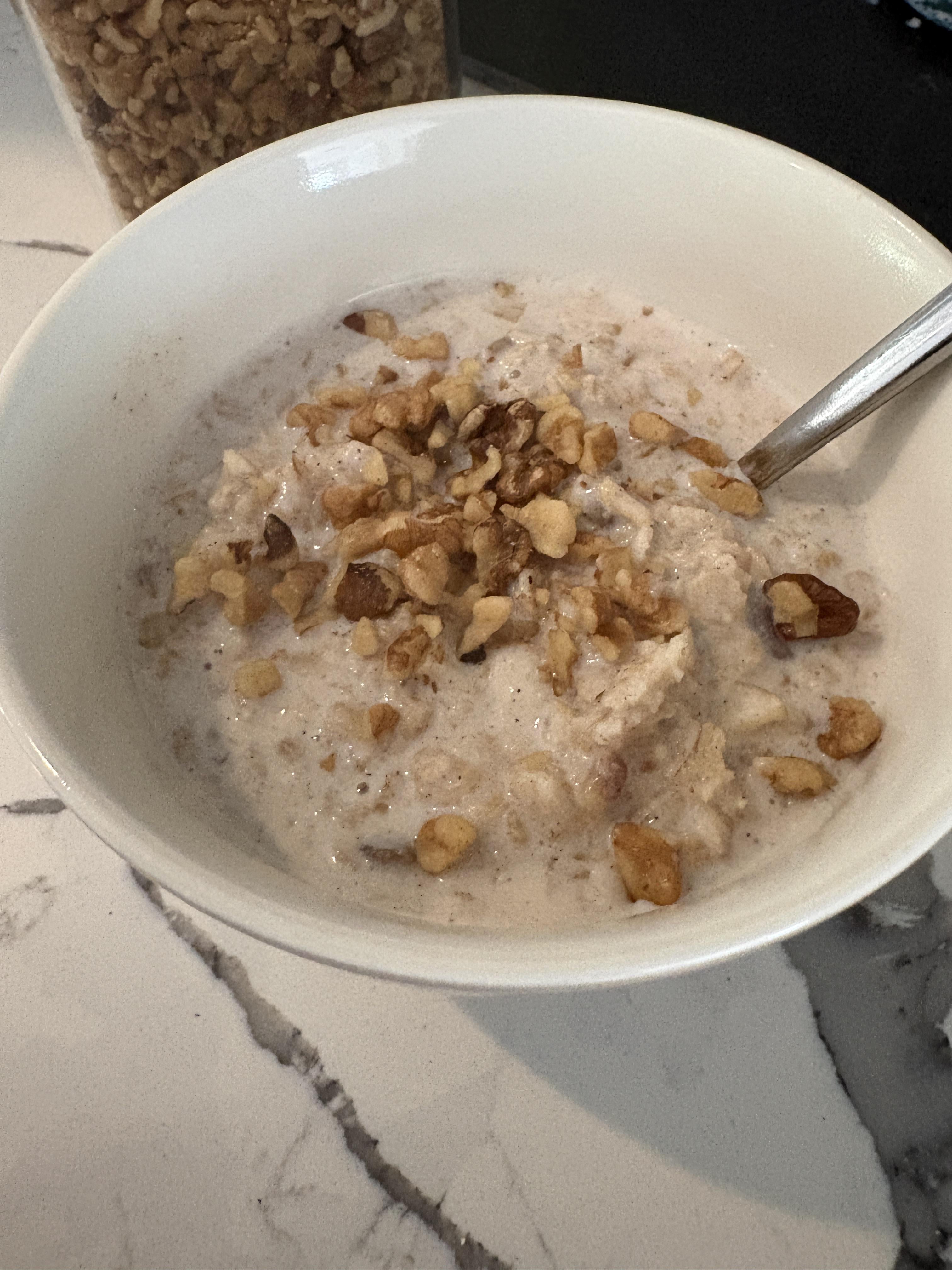 MSH0123 1 week ago Oatmeal cooked in milk, with cinnamon, finely chopped dates, grated apple, and topped with walnuts. The dates were all the sweetness I needed! What else would you add in here?