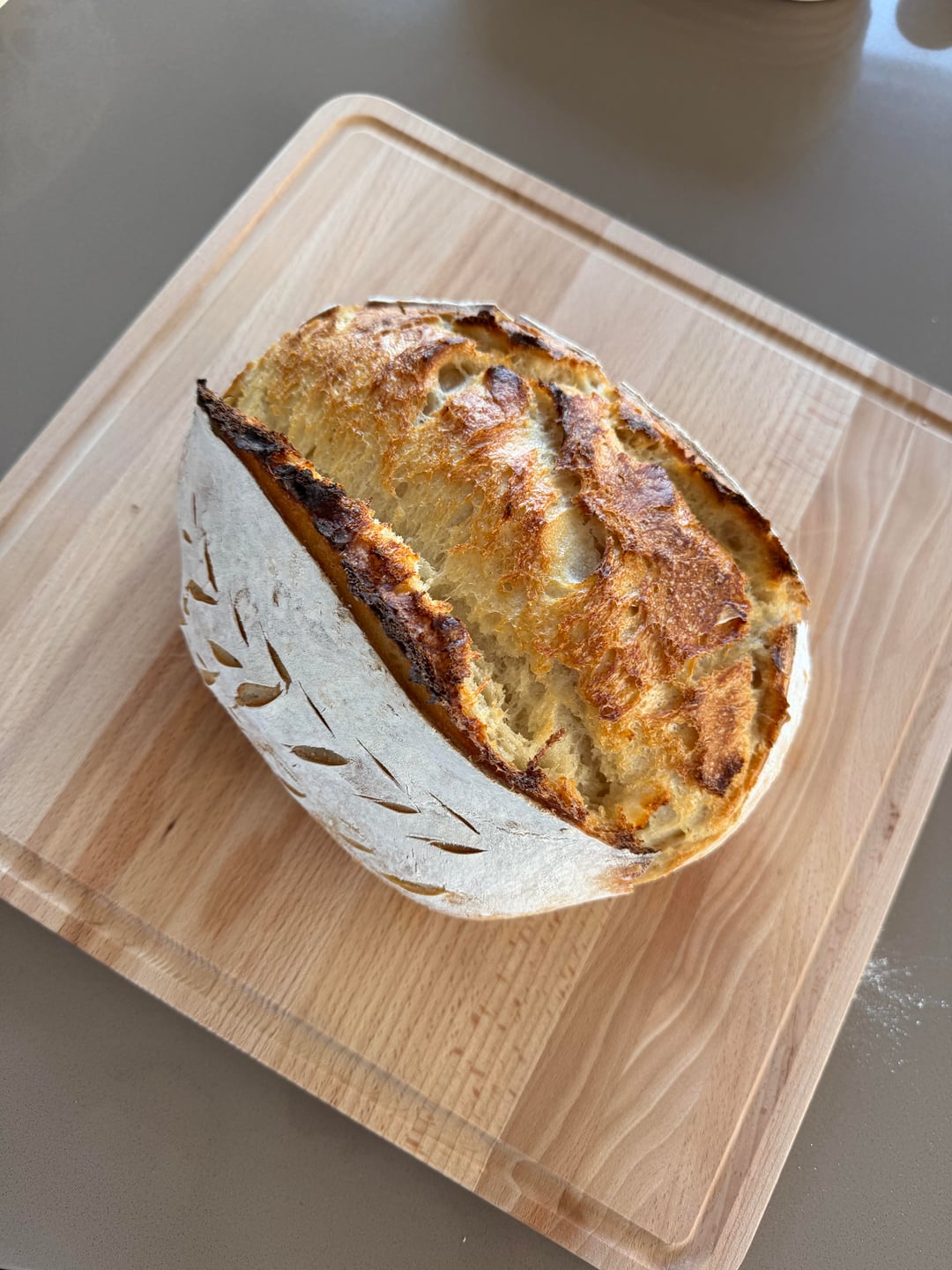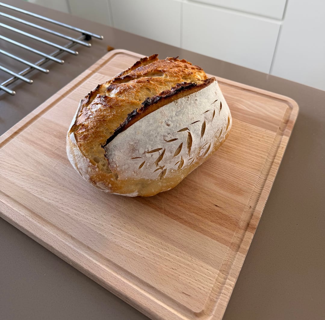 Recipe made 2 loafs, this is one of them: – 1000 g flour – 725 g water – 250 g starter – 22 g salt