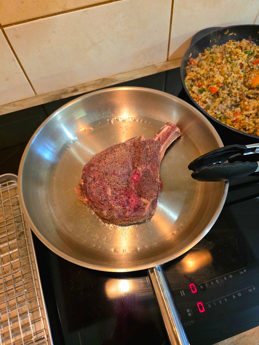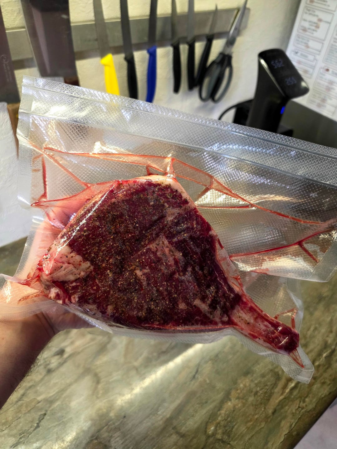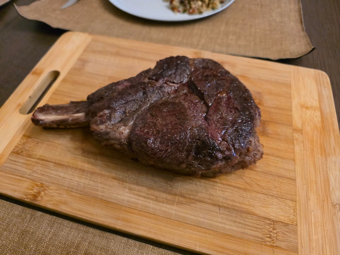 The tastiest and best steak I’ve ever made. First, I dry-brined it on a rack in the fridge for 36 hours, then cooked it for 3.5 hours at 56 degrees Celsius (132.8 degrees Fahrenheit). Finally, I seared it in a stainless steel skillet 🙂