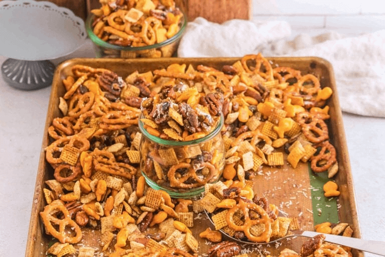 This [**nuts Chex mix** ](https://www.kimschob.com/nuts-chex-mix/)is the snack you’ll be making on repeat. It starts with a buttery, savory Chex base loaded with pretzels and Goldfish crackers, then gets topped with sweet, spiced candied pistachios, pecans, and almonds that take everything to a completely different level.