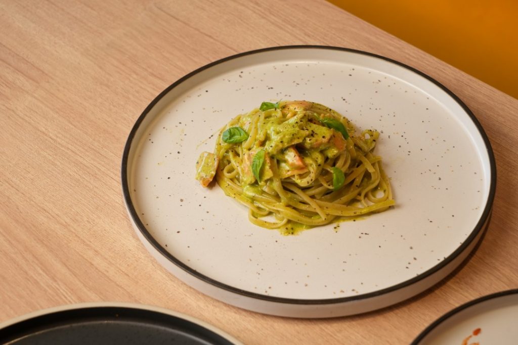 Taking the time to research and review this inspiration, he created this pasta, now one of his proudest creations at Acqua e Farina. The result is perfectly al dente linguine tossed in a silky cream sauce, studded with generous pieces of smoked salmon that lend a delicate, smoky depth. A drizzle of bright, herbaceous pesto cuts through the richness of the pasta, imbuing it with a layer of aromatic earthiness.