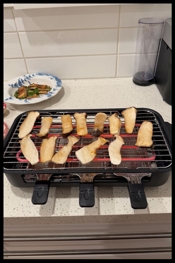 I first tested vegetables on it. The directions in the manual said to cook those on high, so I cranked the heat — the temperature dial doesn’t have discrete markings — and it got hot enough to start smoking lightly in a few minutes. This was the only style of grill that had three little handled rectangular metal trays that went underneath the grill, either to catch grease or melt cheese like raclette. I opted to put a splash of water in each of the three trays so that if grease dripped in it wouldn’t immediately smoke, a trick I learned from past indoor grilling, and first cooked planks of king oyster mushrooms lightly brushed with neutral canola oil (using the included silicone brush) on the grill grate. With the moisture in the mushrooms it took about 15 minutes and a few flips and additional brushes of oil for them to crisp fully.
