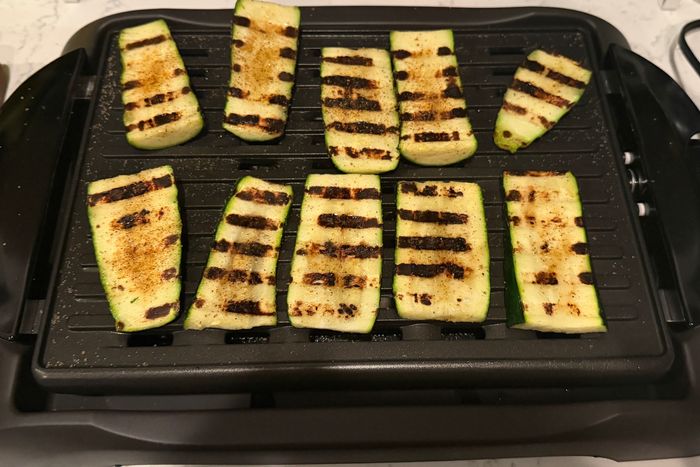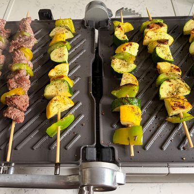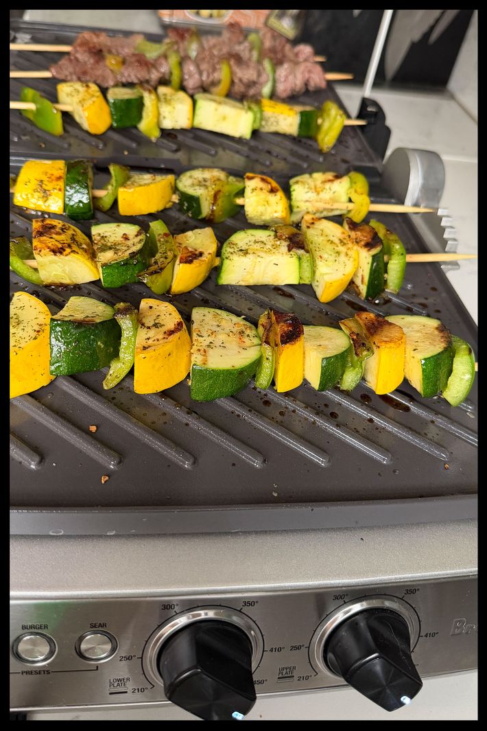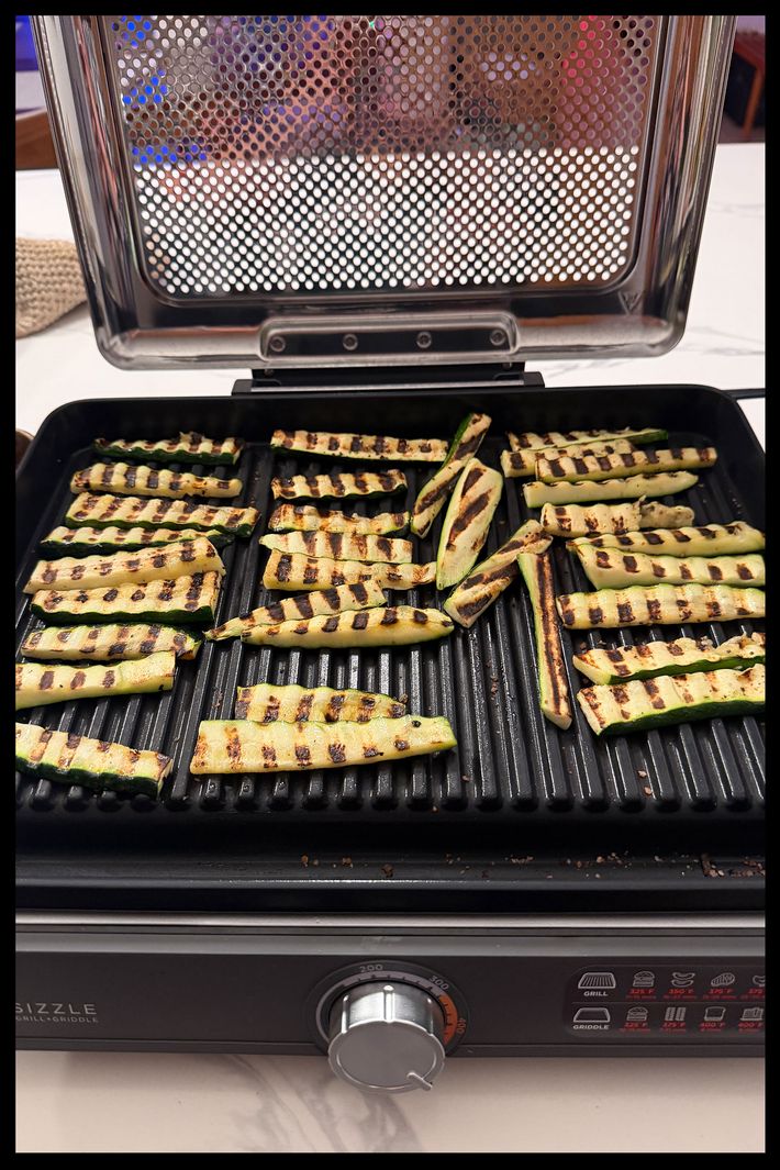 Another TikTok-viral grill, the Ninja has a perforated mesh lid that allegedly helps with ventilation and splatter. The grill and griddle plates, both 14 inches by 15 inches, also have high walls for grease splatter, akin to what you’d see on a large flattop griddle in a restaurant. I tested this at a friend’s house with a bounty of vegetables: zucchini, asparagus, peppers, and mushrooms drizzled with a little olive oil and seasoned with salt and pepper. The manual recommends cooking vegetables at a higher heat and meat at a medium-high heat (it ranges from 200 to 500 degrees) so I cooked the vegetables first with the vent lid off at 450, and they became tender and got great grill marks after about 15 minutes.