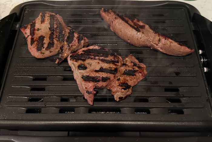 The grill grates heated unevenly, with more hot spots and dead zones than the other grills I tested. When I tried some marinated pork-shoulder slices on it next, parts of the pork started burning before it was cooked through and I opened a nearby window after a burst of smoke emerged. I switched to the “griddle” plate — the one that’s actually more like a grill pan — and was able to get grill marks on the pork and cook it through in about 20 minutes. I used the included silicone-tipped metal tongs, which were a bit small, to flip the meat. I moved the pork around and flipped it more than I did with other grills to make sure any hot spots were accounted for and to circumvent the uneven cooking. The pork tasted slightly char-grilled but wasn’t as evenly bronzed as I would have liked.