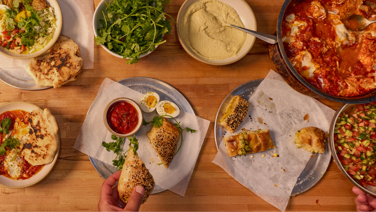 Meny says that the bourekas are a must (and also his favorite menu item). These hand-made Turkish treats are served with house shakshuka sauce, tahini, a gently boiled egg, pickles, and a jalapeno garlic sauce. Filling options include a cheese blend, roasted potatoes and caramelized onion, or spinach and cheese.