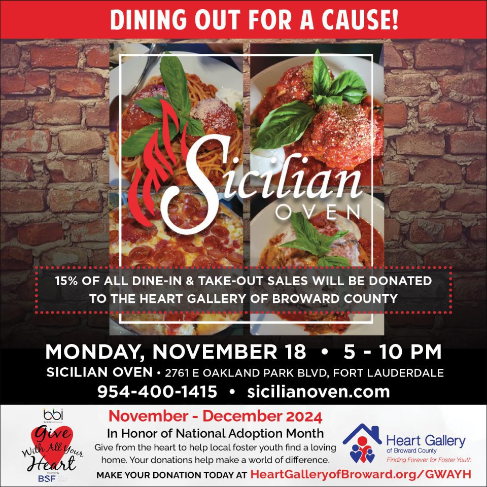 Sicilian Oven is hosting a community dining event, in support of Heart Gallery of Broward County’s Give with All Your Heart campaign, on Monday, November 18, from 5:00 pm to 10:00 pm at Sicilian Oven, the Fort Lauderdale location only. Renowned for its authentic Sicilian cuisine, craft cocktails and inviting atmosphere, Sicilian Oven is the perfect place to enjoy a meal for a good cause.