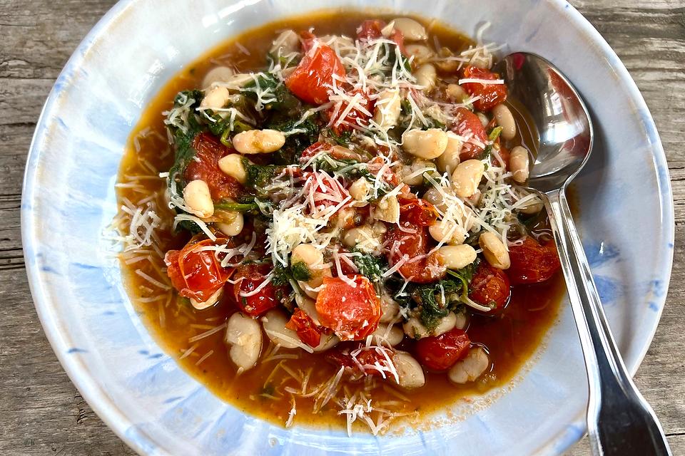 To make this high-fiber, high-protein recipe you will need the following ingredients: fresh greens (think kale, Swiss chard, escarole, spinach, arugula), extra-virgin olive oil, shallots, fresh garlic, cherry tomatoes, canned white beans and Parmesan cheese.