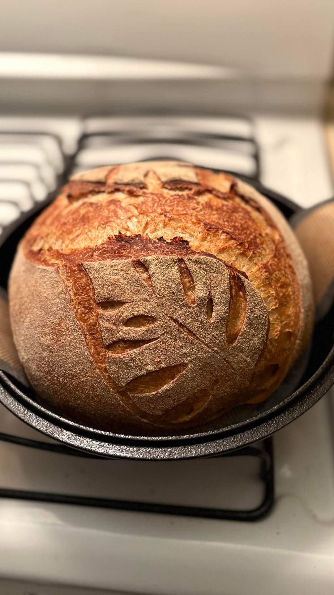 4 rounds of stretch & folds, spaced out by 30 min. Finished bulk fermentation in an instant pot on the low “yogurt” setting for 4 hours. I don’t always have time for cold proofing, so I just shape and freeze for 30-45 min before scoring to help firm up the outside so I get nice, crisp lines.