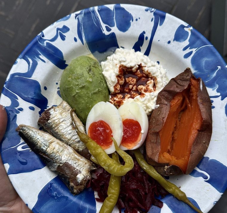 Gizzi made a snack plate with sardines, organic cottage cheese, a roasted Japanese sweet potato, avocado, kimchi, a boiled egg, guindillo green peppers and fermented chilli sauce