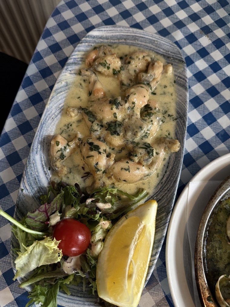 I finally find them at the quaint French restaurant in Islington, so off I trot. These are braised in Calvados and cream, then doused in garlic butter. I have a side of snails too. The restaurant is mid, and they are under-seasoned, but they are exactly as people often describe them – fishy chicken. It’s a roasting day, I’m in black Lycra, living my supermodel dream. I have a glass of Pic Poul and crave my first ciggy in about 30 years. Tres chic.