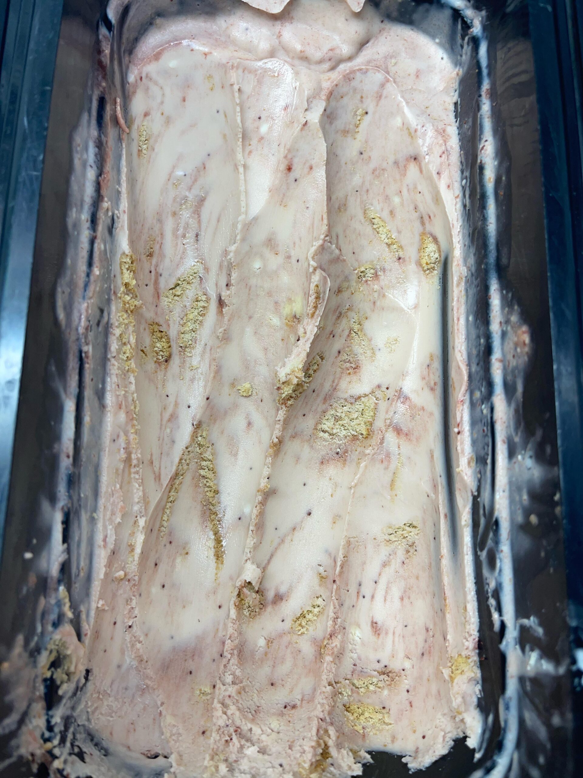 I use our homemade strawberry cheesecake which weighs a little over 3 pounds and add it in with our sweet cream base and then add a swirl of our homemade strawberry sauce and fold in pieces of graham crackers.