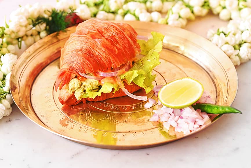 Shile-bata Murgi Diye Bun Pauruti is simply a croissant sandwich with a creamy, hand-pounded chicken filling. The veg variation of the dish has Kumro Chokka Diye Bun Pauruti, where the chicken is replaced by pumpkin.