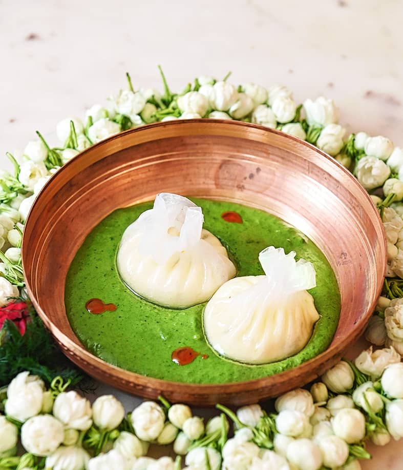 Pork Kosha Aar Shukno Lonka Bhaat is where slow-cooked pork is served with steamed rice cooked with dry chillies to give that extra kick of flavour. The non-veg main course also has Pui Bhetkir Khunsuti — a bhetki dish with Malabar spinach greens.