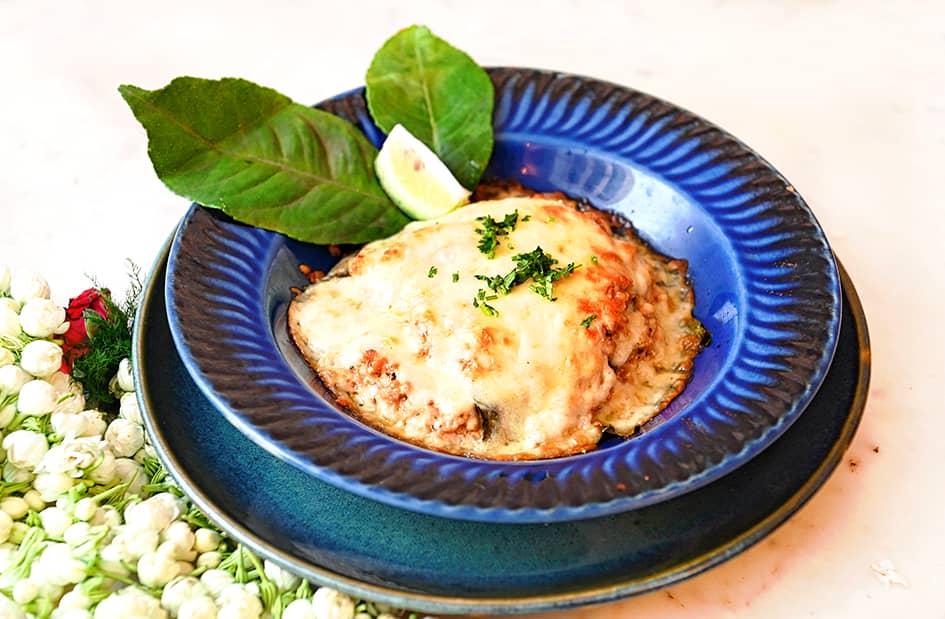 Crab Ala Kanaklata is a mouth-watering crab baked in a cheesy preparation flovoured with gondhoraj lime.