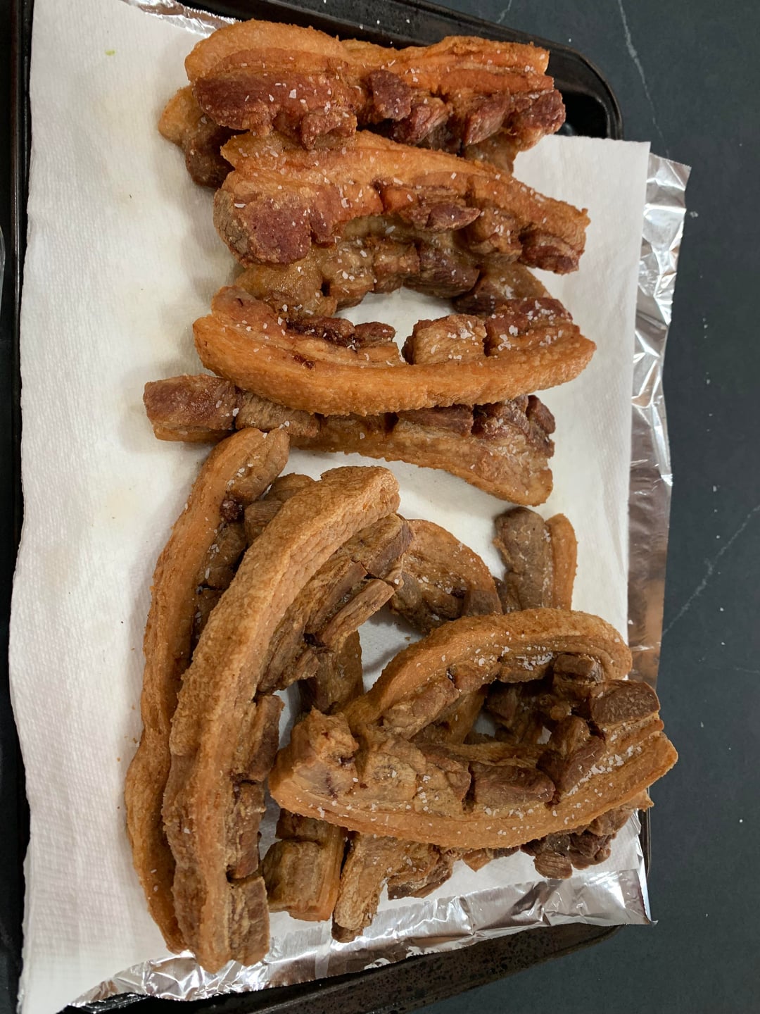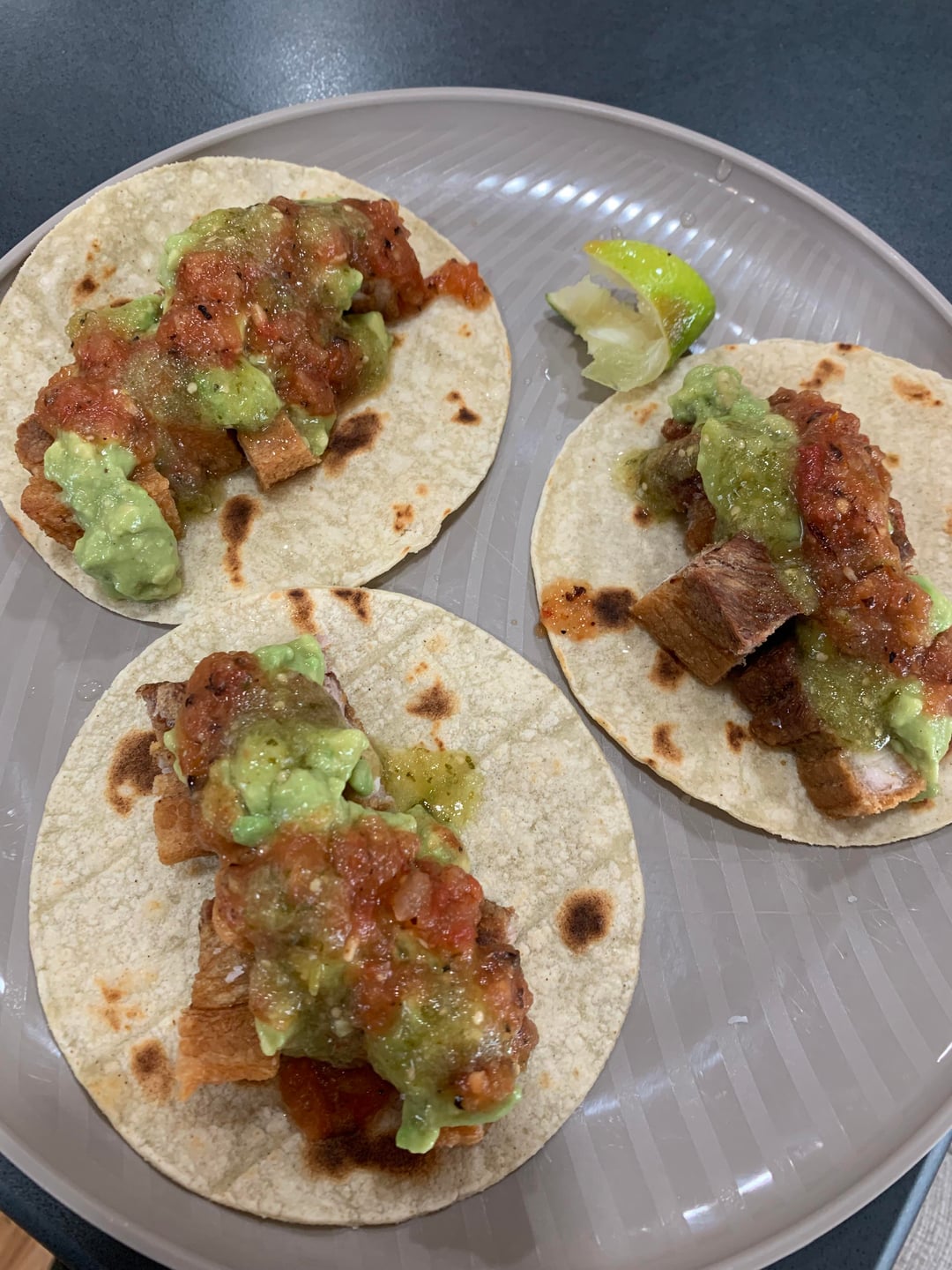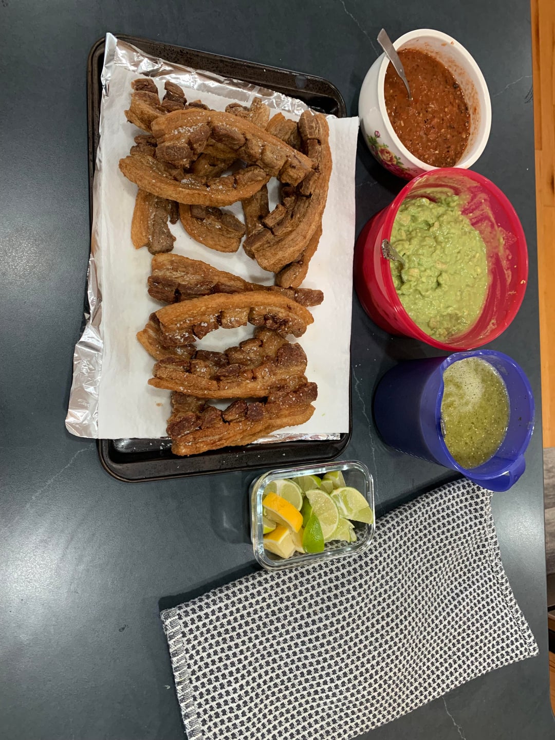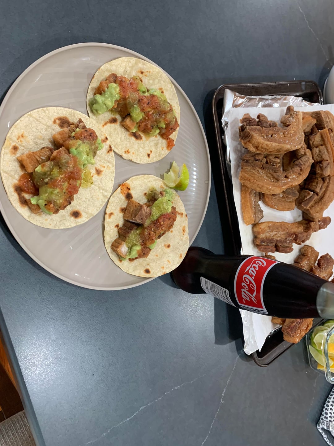Had some pork belly in the freezer and wanted to make room (and tacos de chicharron😋😉). Wife made salsa verde with Serrano, jalapeño, chile California, onion, cilantro, and tomatillo. I made the chicharron, guacamole y salsa tatemada. Didn’t make fresh tortillas😞. Everyone enjoyed it and there’s left overs for anyone that wants some😝🤣🤗.