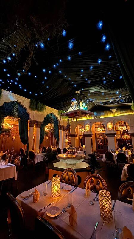 The restaurant has been transformed into a new Aladdin theme including elaborate set pieces, the Cave of Wonders, and Aladdin & Jasmin on their magic carpet ride. Enjoy intricate themeing including treasure chests full of diamonds, rubies and gold, artifacts, a giant magic lamp, Turkish-style lanterns and gold drapery.
