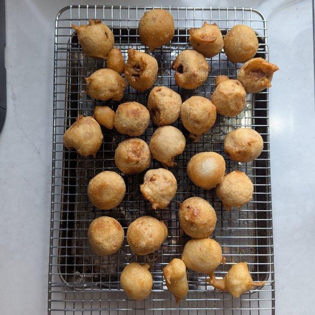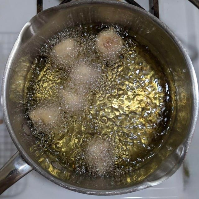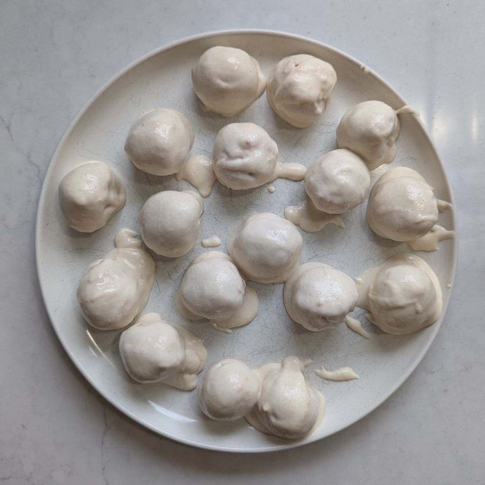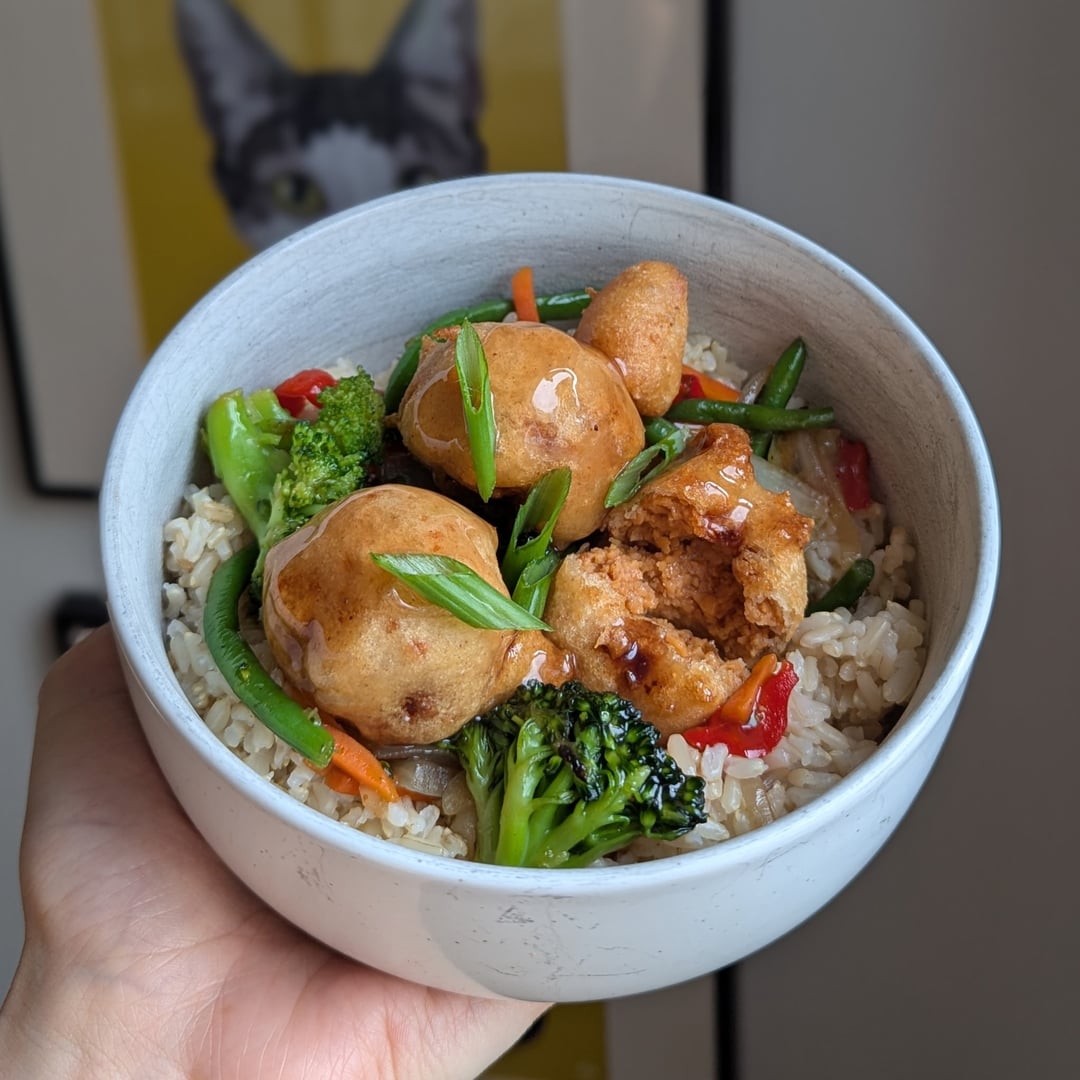 Lightlife Hot Dogs + GF flour + frozen stir fry vegetables + hibiscus tea = hibiscus sweet & sour pOrK balls.