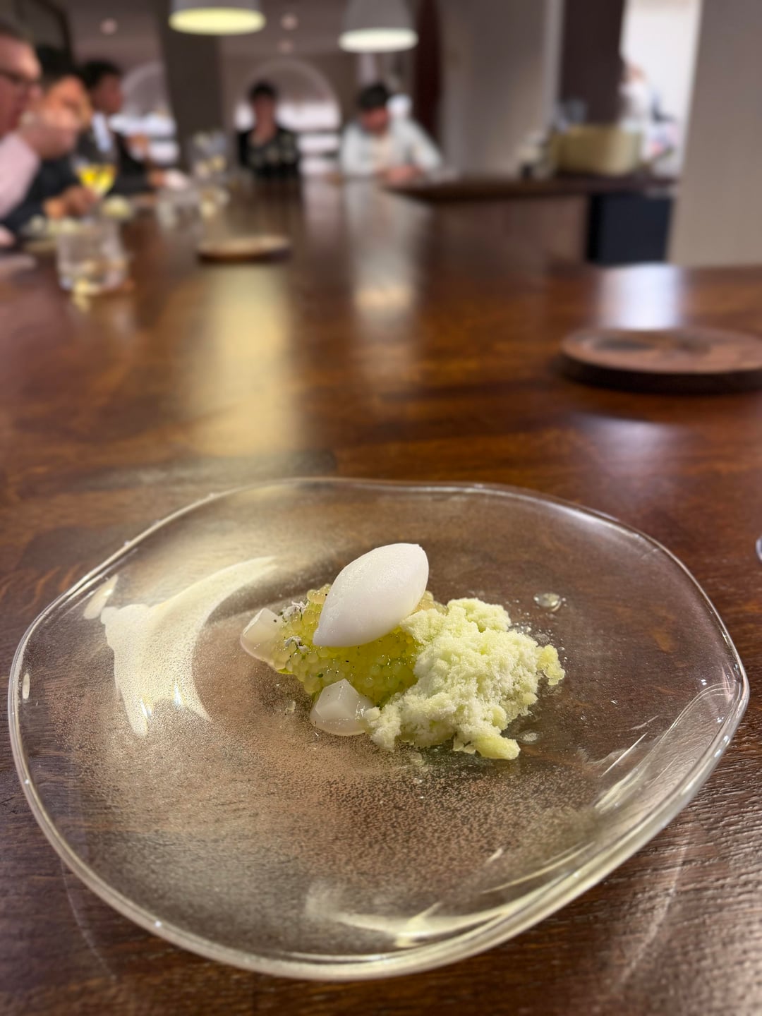 Well, perhaps not. Don’t get me wrong, EMi is great, and very solidly a 1*, but I definitely overhyped it to myself and there are exceptional highs and mid range disappointments. The food, first, starts off quite underwhelming. The snacks don’t hit with flavour and a seaweed one had a particularly chewy texture where the kelp has been made into a tartlet. An early dish of almond and peas is wildly unbalanced, tasting of absolutely nothing but over-sweetened almonds. However, as the meal progresses, the food does improve, and we have a piece of fish and then a piece of venison that are two of the best cooked pieces of protein I’ve ever eaten. The venison main, with lobster head curry, is in fact, one of the finest main courses I’ve ever eaten anywhere. It’s divine, and the same can be said for a chawanmushi with duck and lobster.