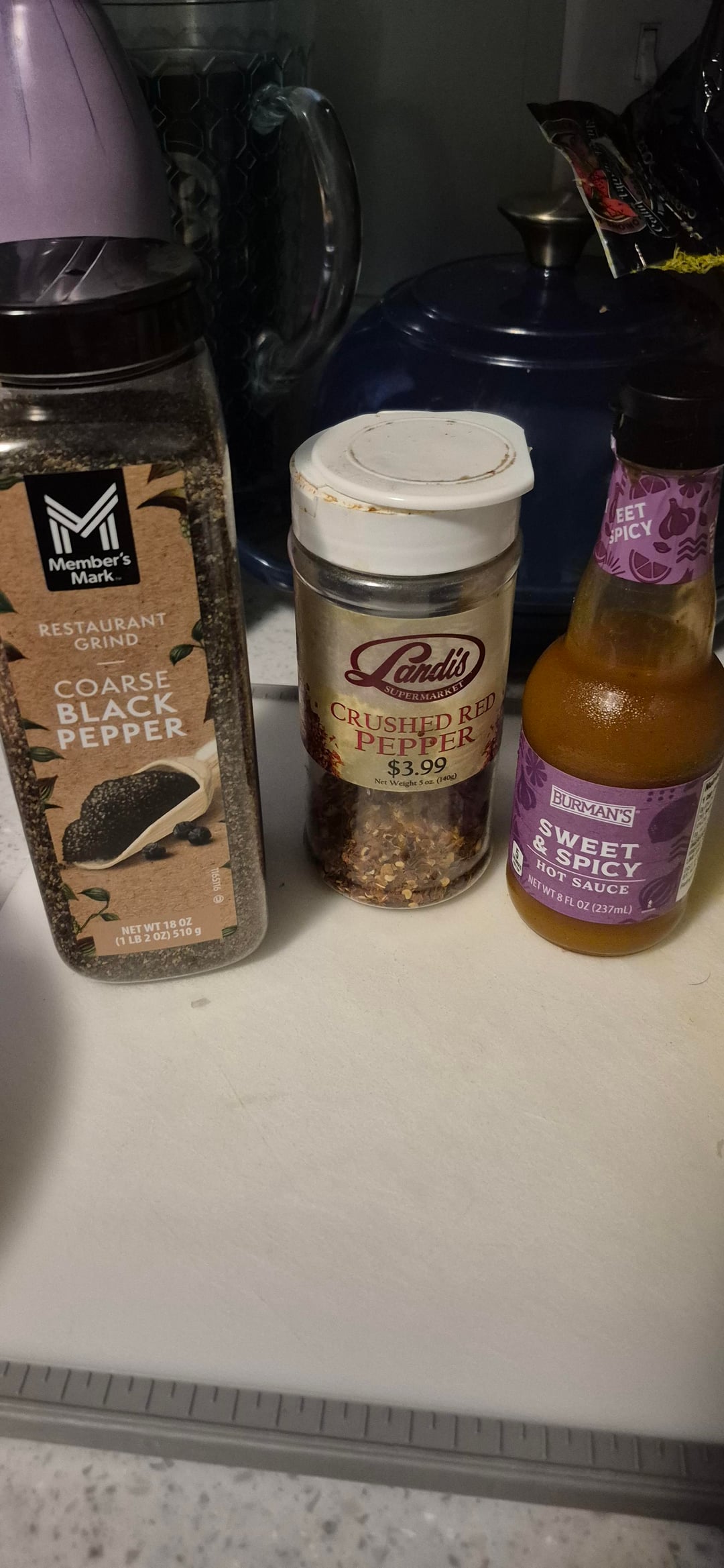 Pat of butter, Aldi sweet and spicy sauce I've needed to use up, butcher cut black pepper and crushed red pepper flakes.
