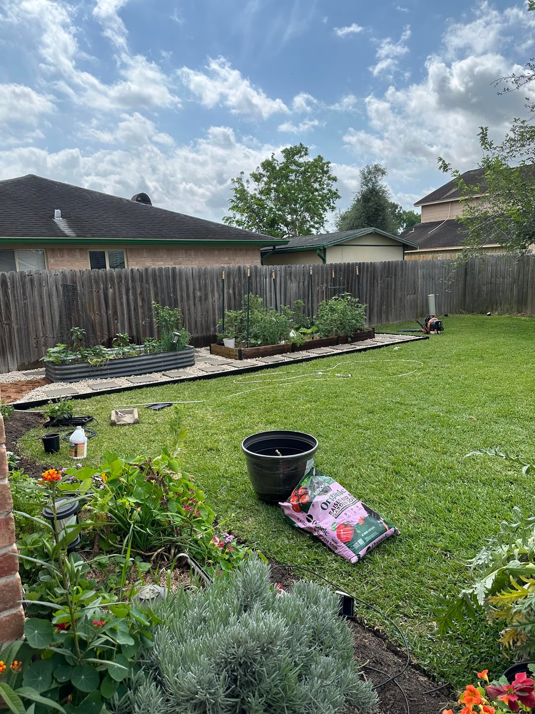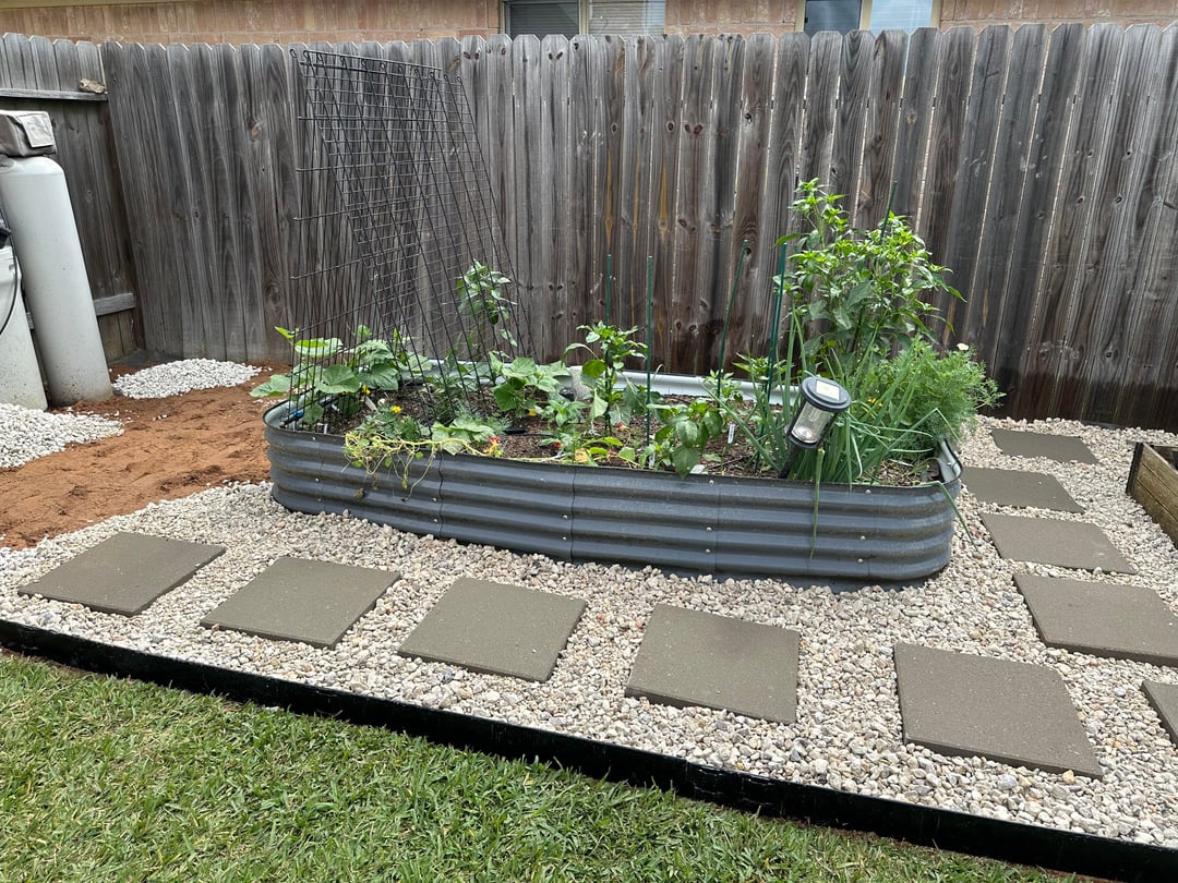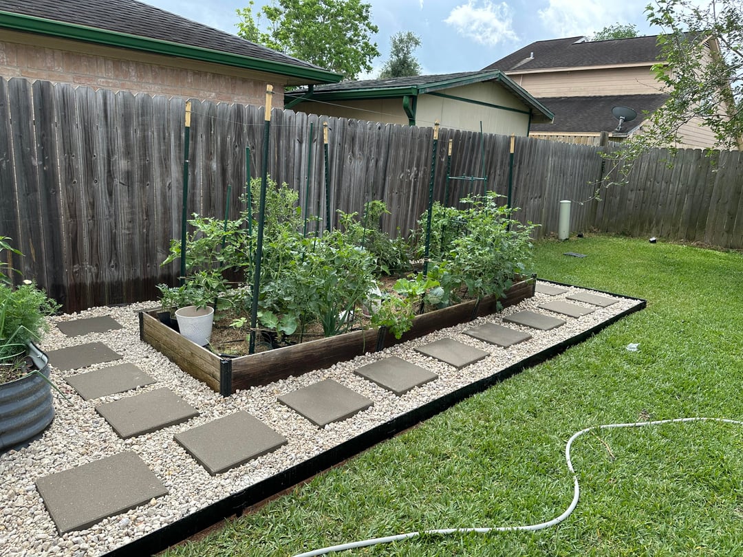 Two years after I set my garden up, finally getting around to adding pavers. Southeast Texas 9b. I can now handle the tomatoes without standing in wet mushy grass and dirt. In this humid climate, the back was starting to smell a little with the fertilizer and rain.