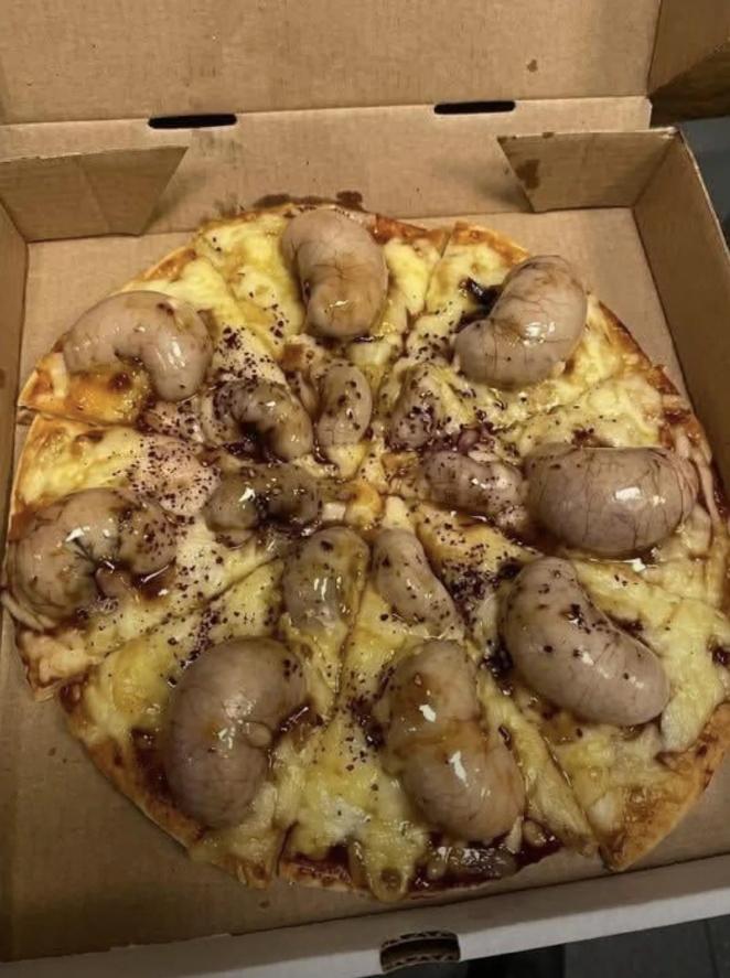 If they were sliced the pizza would be ten times more appetizing AND ten times easier to eat. Imagine trying to bite a slice only for one of the testes to fly through the room at mach fuck.