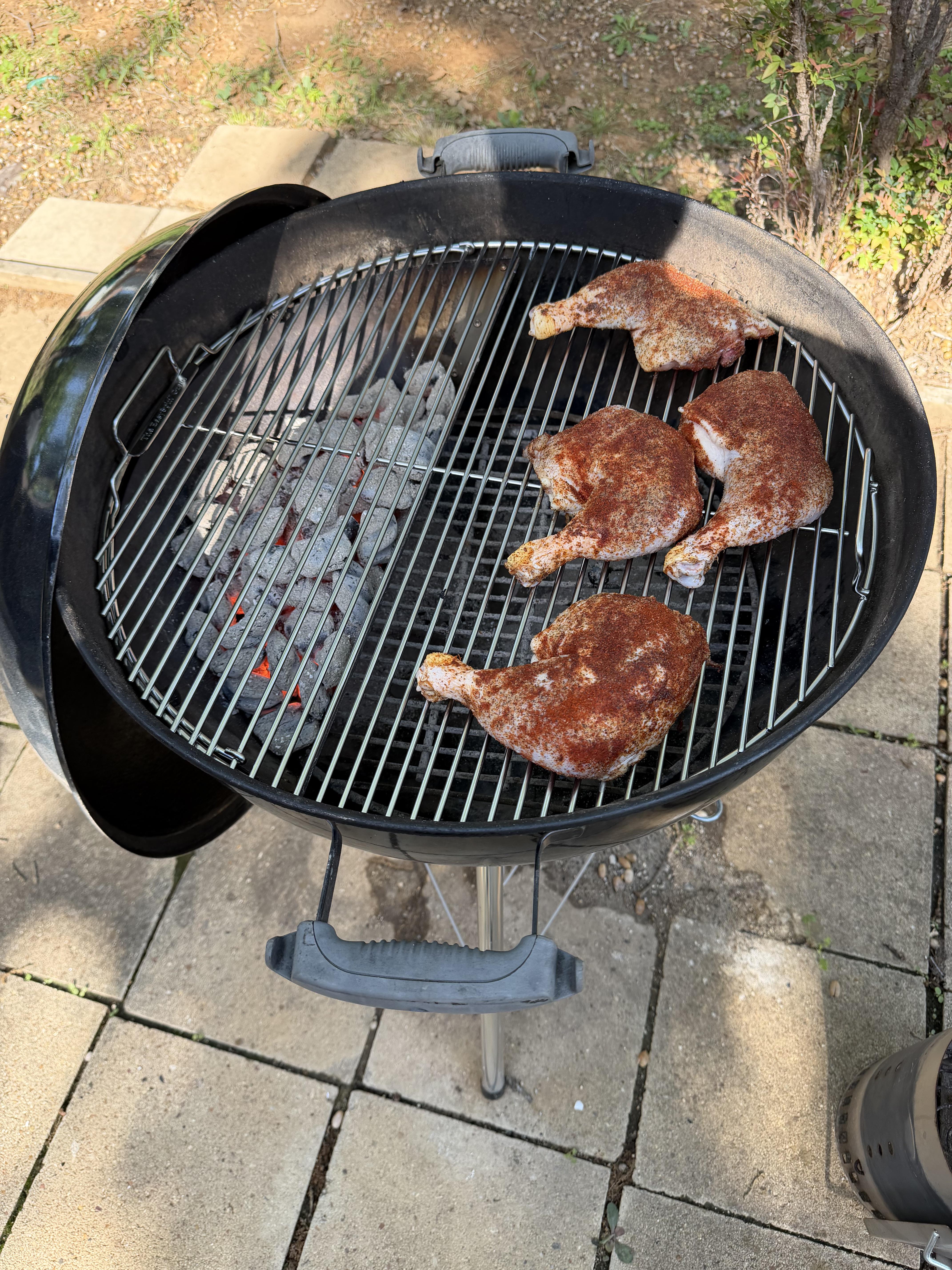 First attempt at indirect cooking on my Weber kettle. Got the slow n sear deluxe with the water trap removed. Doing some chicken quarters and cooking based off the Chud’s Weber kettle series chicken quarters. I’ll touch base when I get done. Any tips?