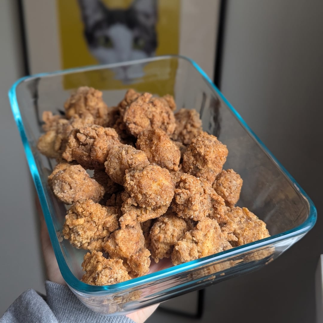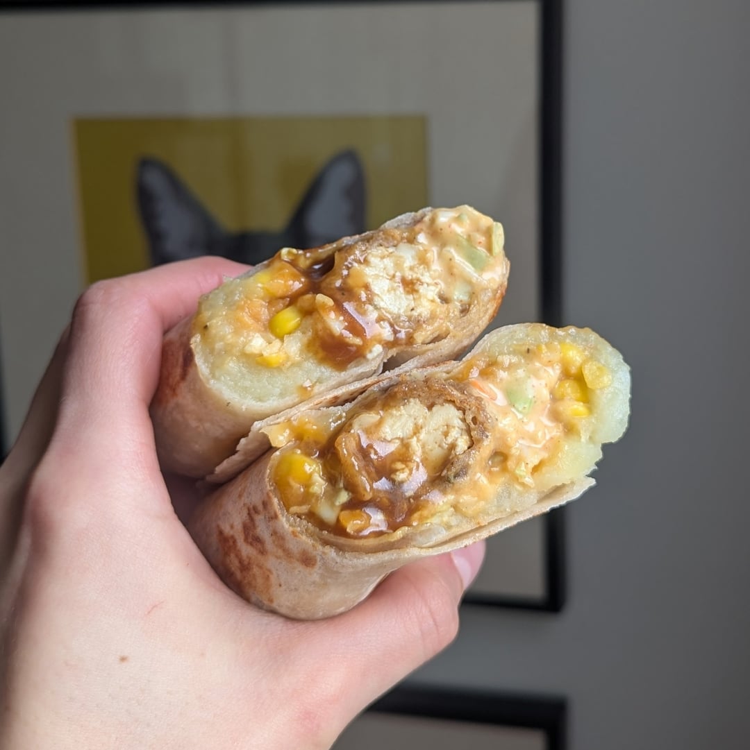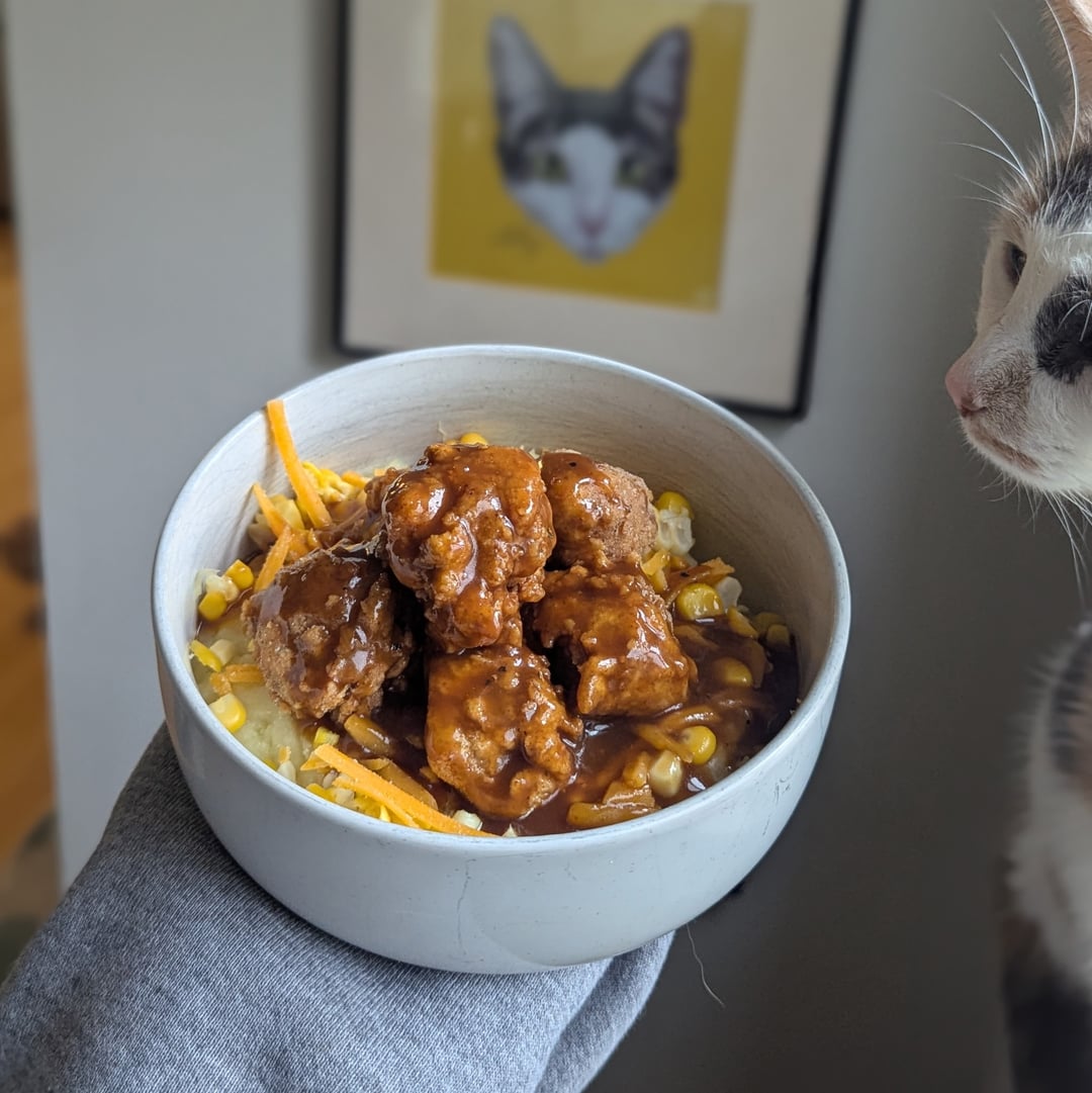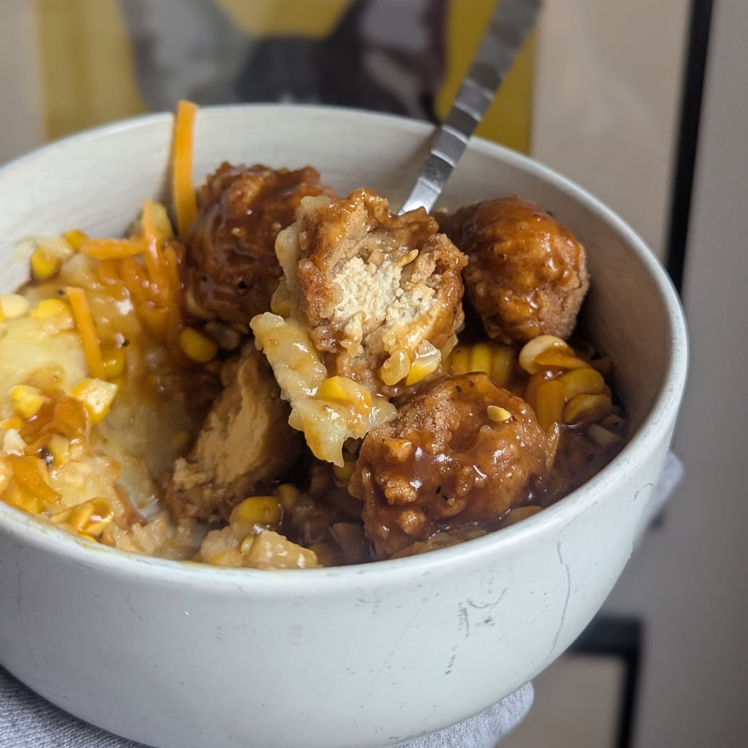 A classic bowl of sadness. Homemade mash, homemade gravy, fresh sweet corn, shredded inauthentic cheese product, and hand-breaded and deepfried soy boy bites. Same deal in the burrito but with Colonel’s Secret Slaw. 🫡
