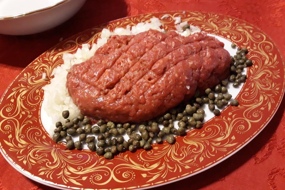 French dish made with raw ground beef, onions, capers, Worcestershire sauce, egg and other ingredients. Sometimes the ingredients are mixed into the meat, but you’ll also find some ingredients served separately so you can add them to taste, which is how my father-in-law serves his.