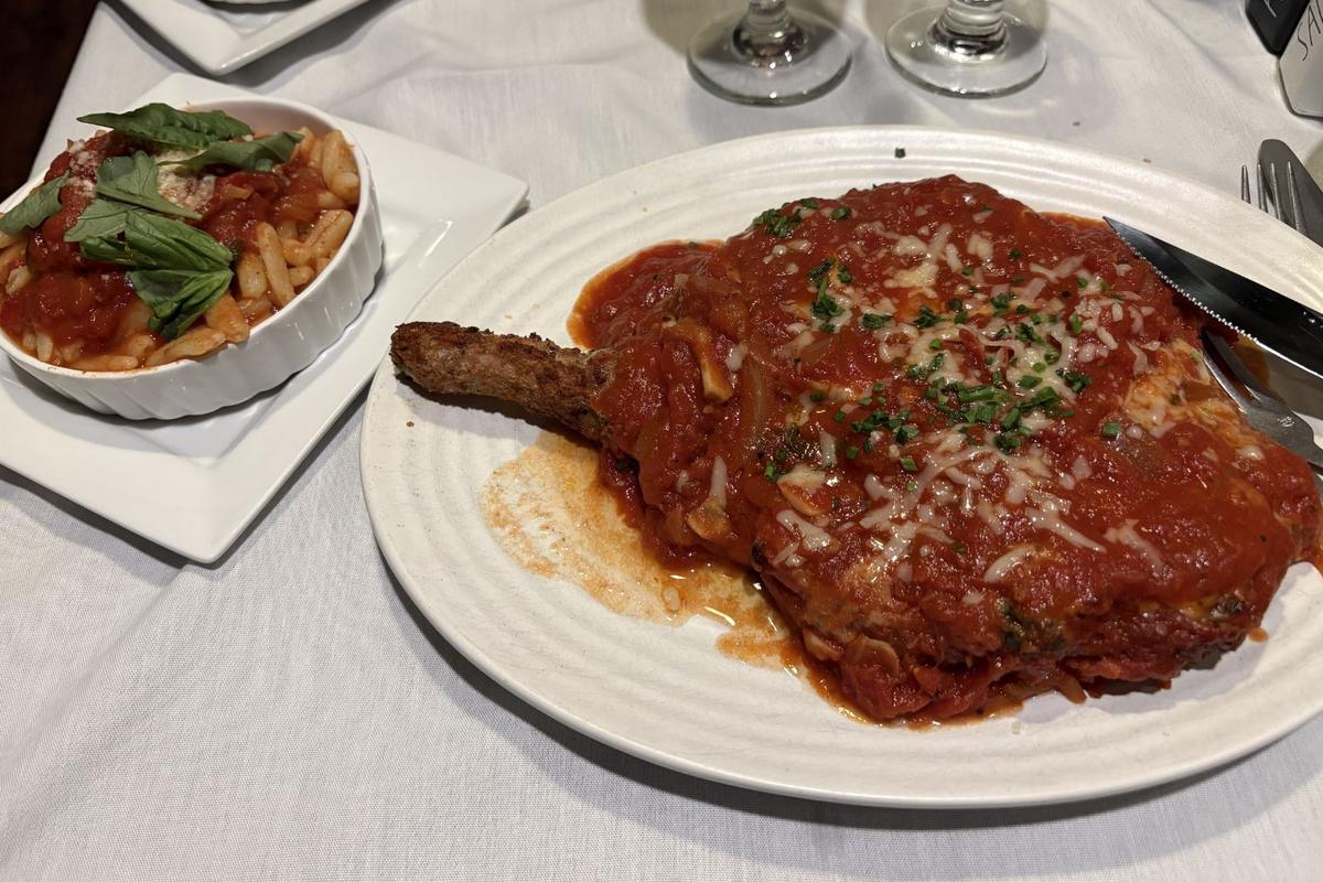 I got the pork chop Parmesan fra diavolo. It’s got hot and sweet peppers, San Marzano tomato sauce, melted provolone, and ricotta gnocchi. I subbed the gnocchi for cavatelli. You can find their dinner menu here. And their lunch menu here.