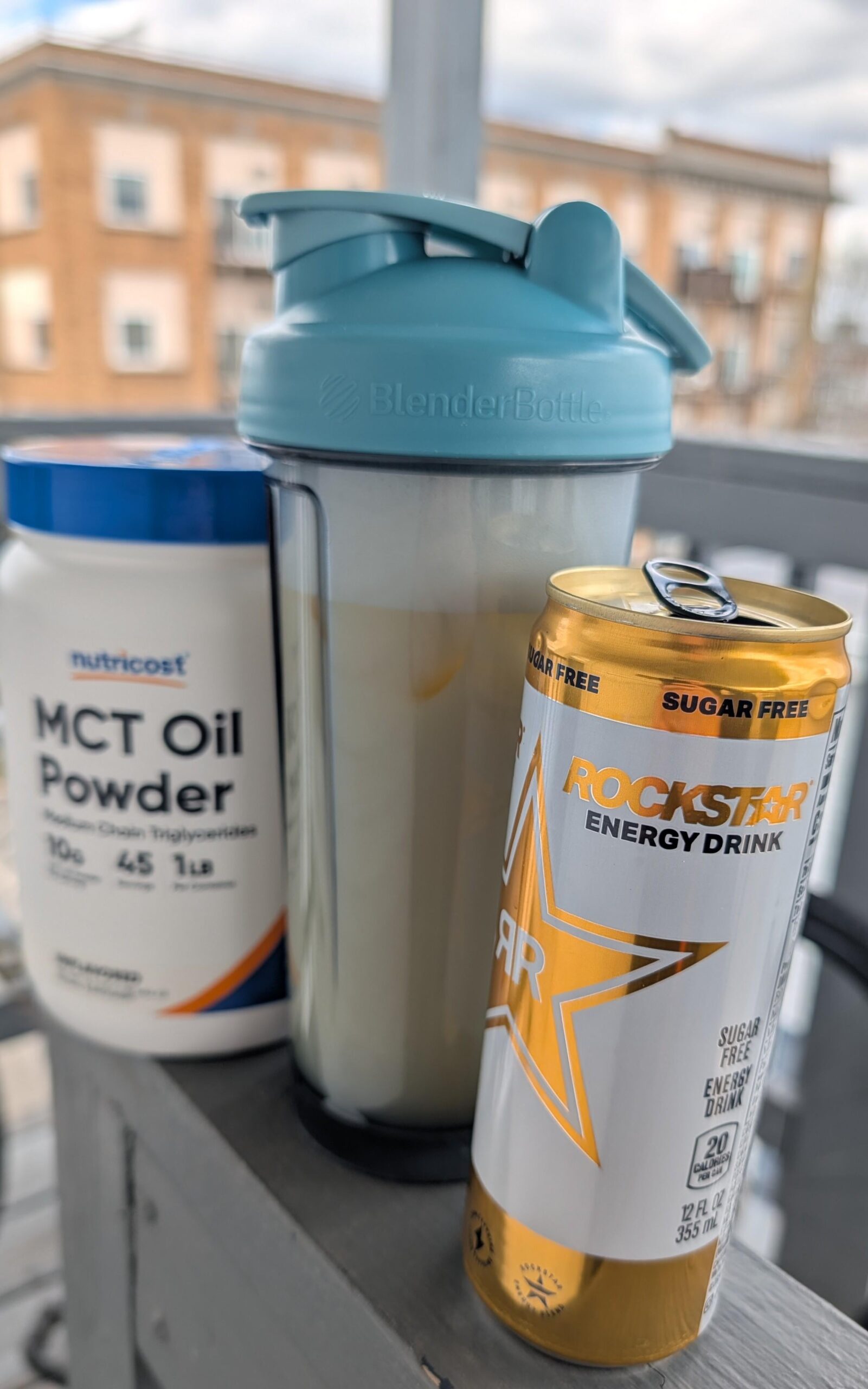 Pour 1/3 cup water and 1 scoop unflavored MCT oil powder in blender bottle and shake well. Add ice and pour in a zero sugar rockstar, shake gently. Some of the rockstar zero varieties have a couple carbs, this one has zero, and 20 calories for a recipe total of 80. Find at $1.25 stores.