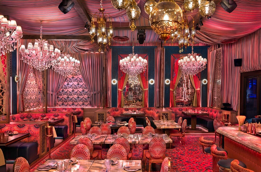 As the evening progresses, the atmosphere evolves from refined dining into a vibrant supper club experience. Performers move throughout the venue, transforming the dining room into an interactive stage where belly dancers, percussionists, and contortionists create a rhythmic pulse of entertainment. This theatrical dimension elevates the venue beyond the typical restaurant model, placing Habibi Miami among the most immersive nightlife experiences in the city. Guests do not simply dine here; they participate in a curated spectacle that blends music, performance, and culinary artistry.