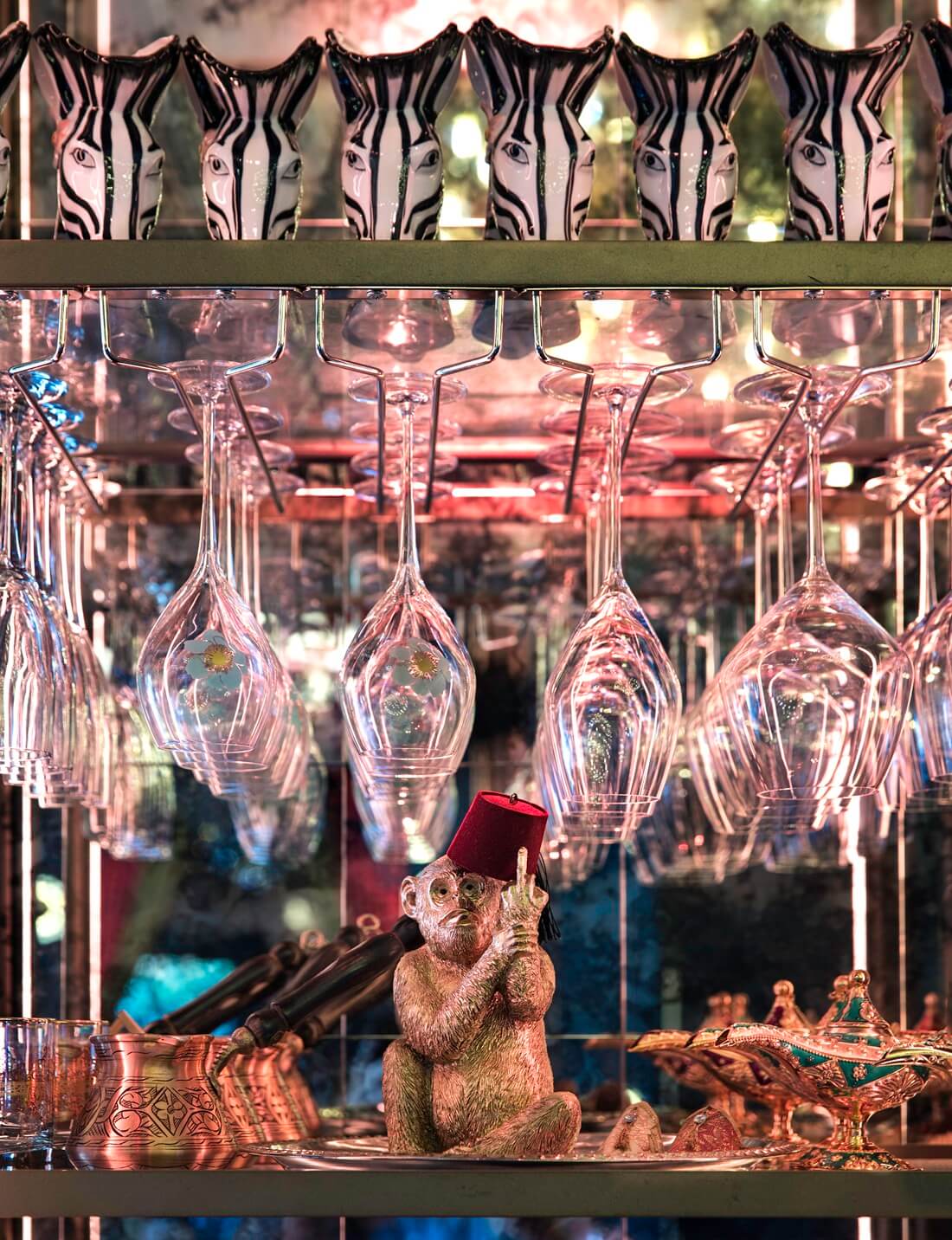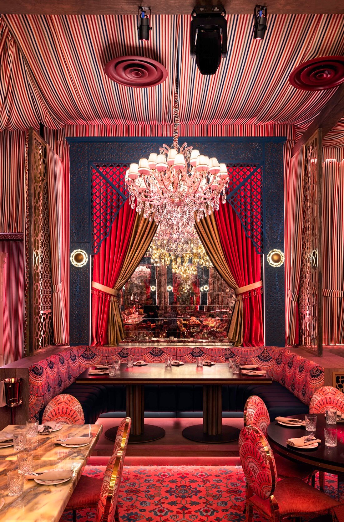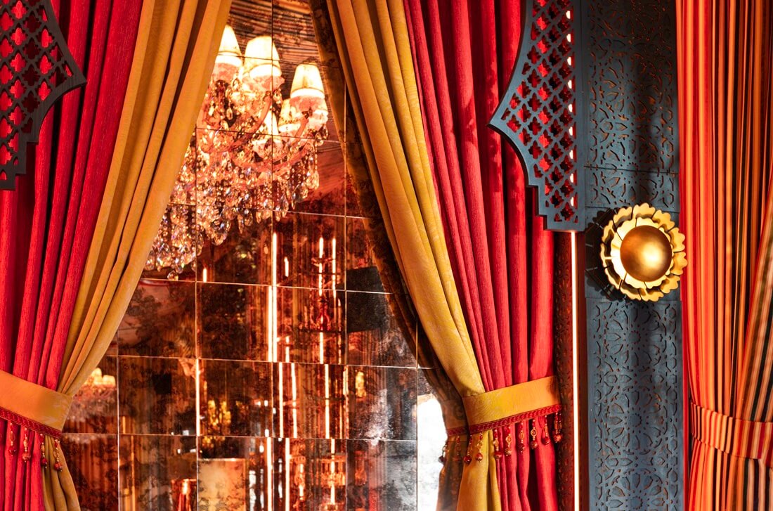 Beyond the cuisine, Habibi Miami distinguishes itself through its striking visual identity. The restaurant’s design draws inspiration from Moorish architecture and the ornate riads of North Africa, immersing guests in a dreamlike environment that feels worlds away from the surrounding city. The interior concept, created by Creative Director Mark Lehmkuhl of Ghosthouse Design Group in collaboration with Love Lake Studios, combines cinematic aesthetics with playful color palettes of pink and teal. The result evokes a retro Mediterranean fantasy reminiscent of Tangier during its artistic golden era, creating a space that feels simultaneously nostalgic and contemporary.