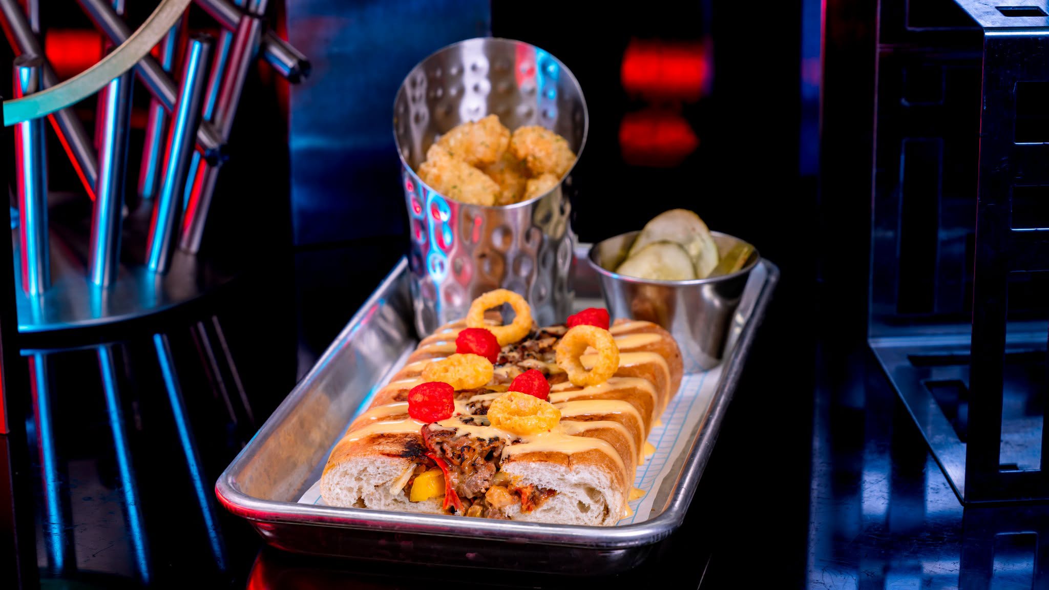 In Avengers Campus, Pym Test Kitchen will introduce the Philly Cheesesteak Grilled Cheese. This is a pepper and onion grilled cheesesteak topped with cheese sauce and crunchy manipulated particles served with potato bites.