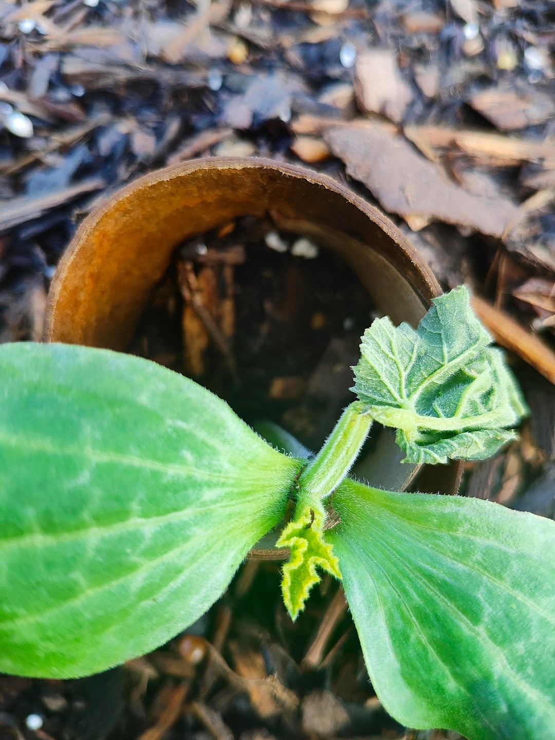We have been having some strong gusts of wind come through today along with some cooler weather (50s – 60s F, usually we are 70s – 80s F). I have a tp roll sheltering the seedling as it's been growing outside by itself in a planter box but the roll along with the plant was completely tipped over by the wind for a few hours and I noticed the first true leaf that was growing appears pinched off and as a result it wilted. 🙁